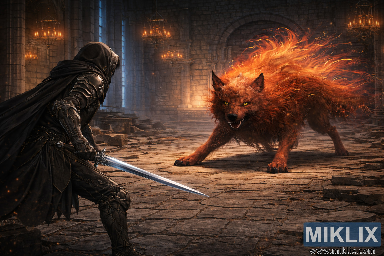 La stylisation réduite et l’éclairage réaliste amplifient le sentiment de danger et d’immédiateté. L’espace entre les deux silhouettes semble chargé et fragile, comme si un seul souffle pouvait briser le silence. Le contraste entre l’ombre et le feu, l’acier et la chair, la détermination maîtrisée et l’agressivité sauvage définit la scène. L’image capture un battement de cœur suspendu de terreur et de détermination, incarnant le ton sombre et impitoyable du monde d’Elden Ring.