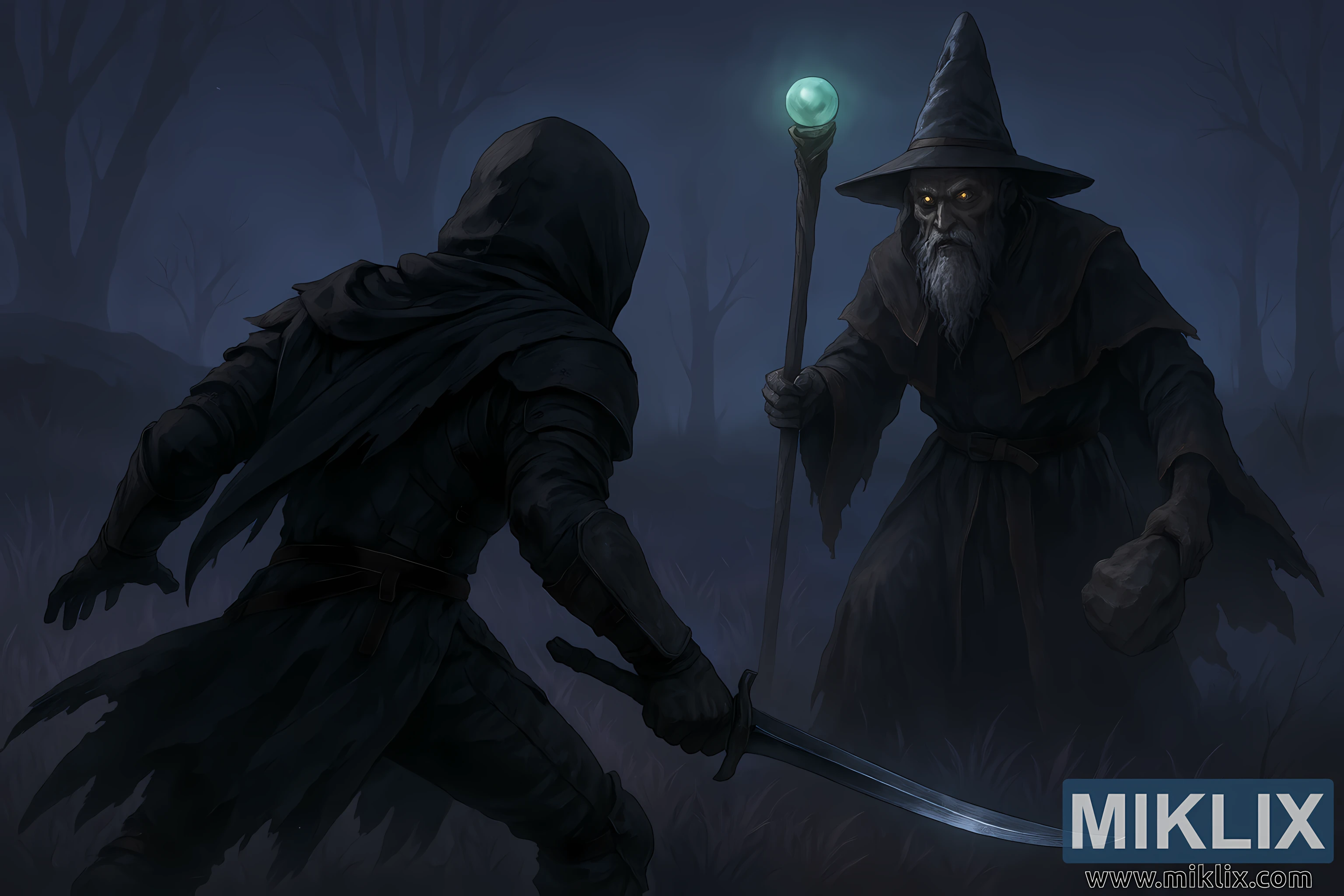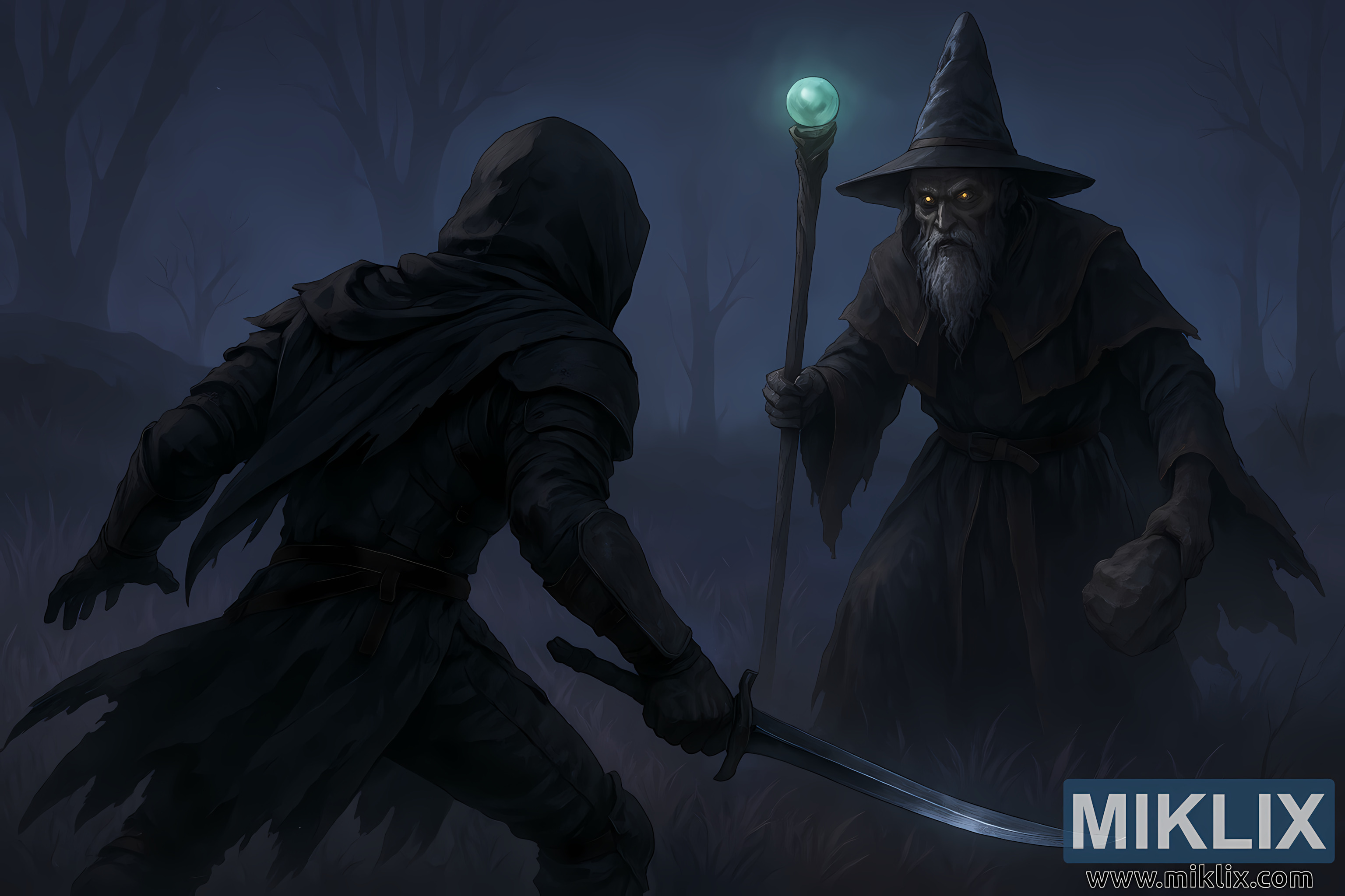 En face de lui se tient le Mage de Bataille Hugues, un sorcier mort-vivant imposant vêtu d’une longue robe en lambeaux d’un violet profond. Les bords de la robe sont effilochés et usés, serrés à la taille par une ceinture de cuir fissurée. Son visage squelettique est partiellement caché sous un grand chapeau noir pointu à la pointe tordue, et ses yeux jaunes brillants brûlent d’une fureur arcanique. Une longue barbe grise en désordre retombe sur sa poitrine, accentuant son apparence ancienne et menaçante. Dans sa main gauche, il lève un bâton de bois noueux couronné d’une sphère verte lumineuse, qui projette une lumière maladive sur son visage et ses robes. Sa main droite serre une arme de pierre dentelée, tenue basse et prête.