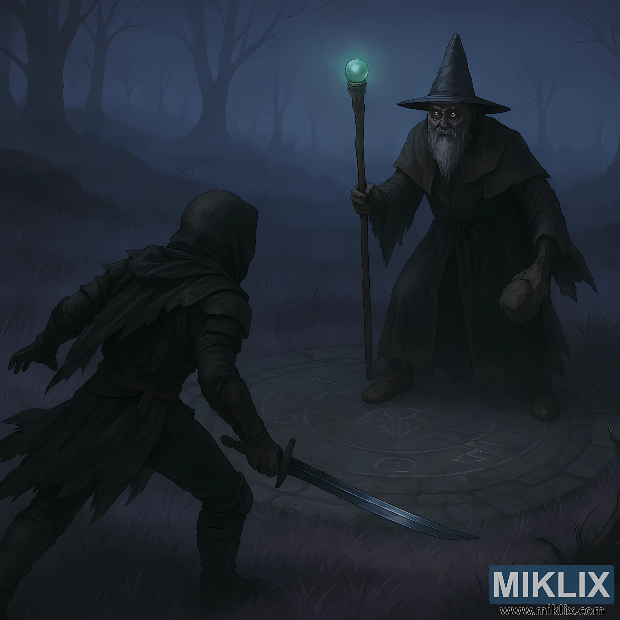 En face de lui, le Mage de Bataille Hugues se tient droit et imposant dans le cercle de pierres. Sa longue robe violette foncée est effilochée sur les bords et serrée à la taille par une ceinture de cuir fissurée. Un grand chapeau noir pointu couronne sa tête squelettique, projetant des ombres sur son visage émacié et barbu. Ses yeux brillent d’une lumière jaune malveillante, et son expression est celle d’une résolution sombre. Dans sa main gauche, il lève un bâton de bois noueux surmonté d’une sphère verte lumineuse, qui projette une lumière étrange sur ses robes et la brume environnante. Sa main droite serre une arme de pierre dentelée, tenue basse et prête.
