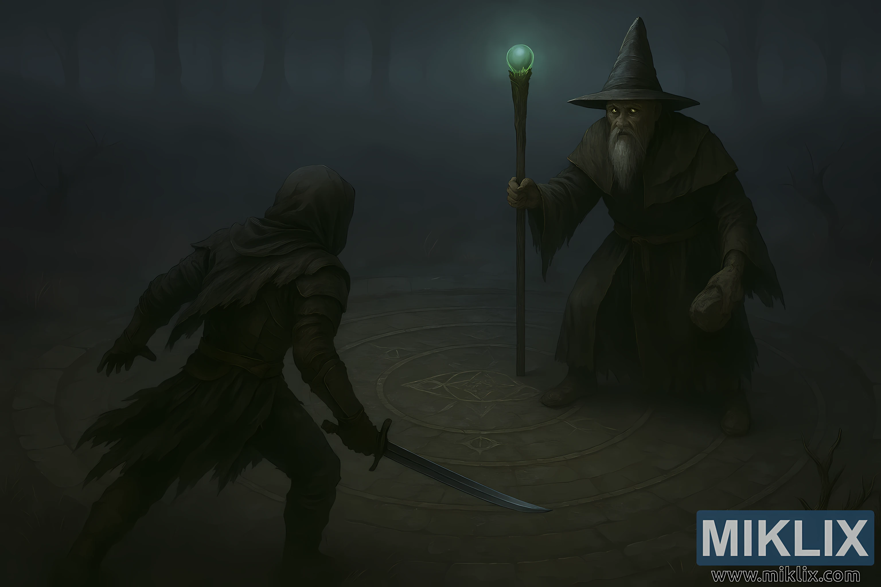 En face de lui, le Battlemage Hugues se dresse du côté droit de l’arène circulaire. Il porte une longue robe violette foncée aux ourlets effilochés et une ceinture de cuir fissurée. Son visage squelettique est partiellement caché sous un grand chapeau noir pointu, et ses yeux jaunes brillants percent la pénombre. Une longue barbe blanche et négligée déborde sur sa poitrine. Dans sa main gauche, il lève un bâton de bois noueux couronné d’une sphère verte lumineuse, projetant une lumière étrange sur sa robe et la brume environnante. Sa main droite serre une arme de pierre dentelée, tenue basse et prête.