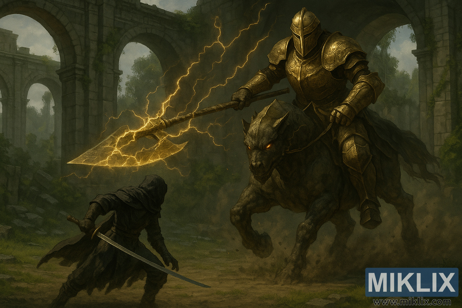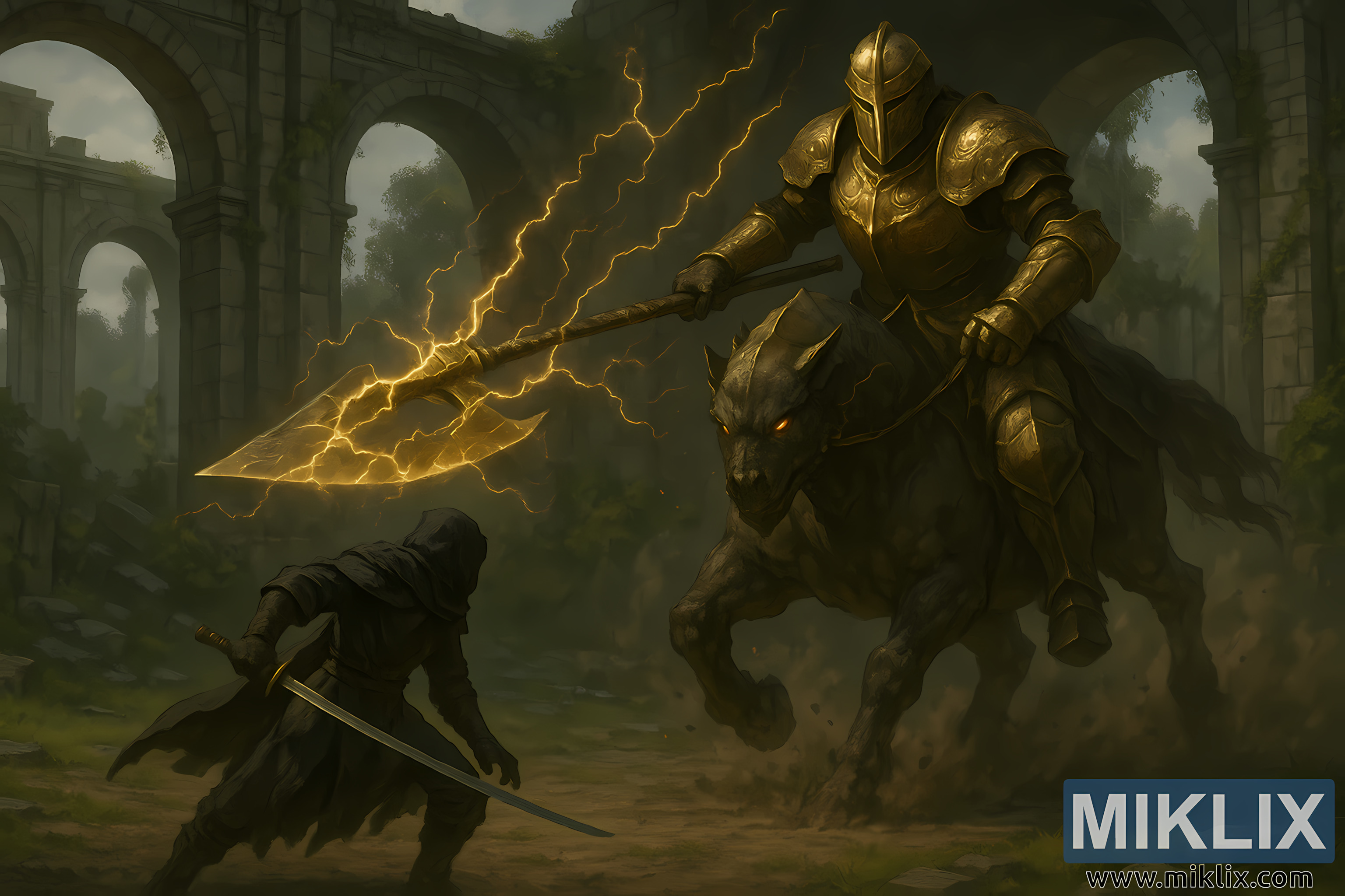 L’environnement cadre le duel d’une manière qui souligne à la fois l’échelle et l’ambiance. D’anciennes arches en pierre et des structures en forme d’aqueduc s’étendent à l’arrière-plan, partiellement brisées et reconquis par la nature. Le lierre, la mousse et le feuillage rampant s’accrochent à la pierre pâle, tandis que la lumière brumeuse filtre à travers les interstices et ouvertures, créant des poches de brume atmosphérique. Les couleurs penchent vers des verts désaturés, des gris et des ors atténués, donnant à la scène une ambiance sombre et condamnée. Le Sans-éclat paraît petit mais défiant face au chevalier imposant et aux ruines voûtées, évoquant la sensation classique d’Elden Ring d’un guerrier solitaire et fragile face à une menace divine colossale. Dans l’ensemble, l’image allie réalisme et fantaisie, capturant un moment unique et chargé juste avant que le coup éclair de la hallebarde et la contre-coupe désespérée du katana ne décident du sort de l’affrontement.