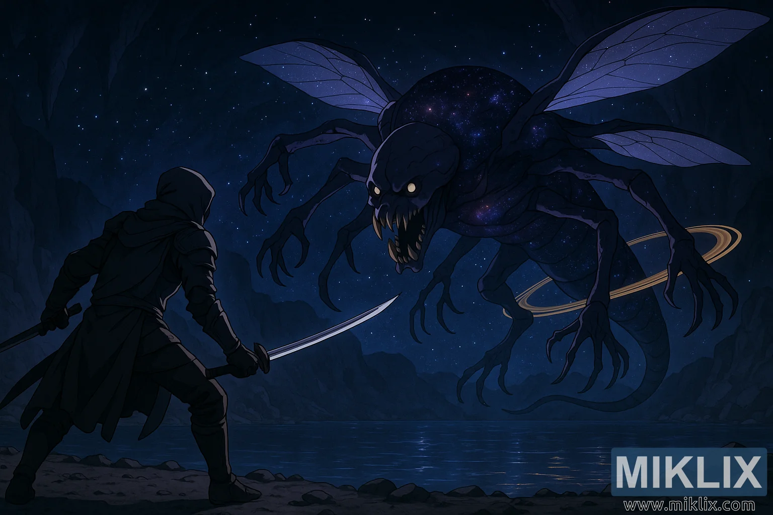 Une illustration haute résolution de style anime d’un guerrier Black Knife affrontant Astel, Stars of Darkness, représenté avec des mandibules, une posture insectoise et des anneaux planétaires dans un vaste lac de caverne.