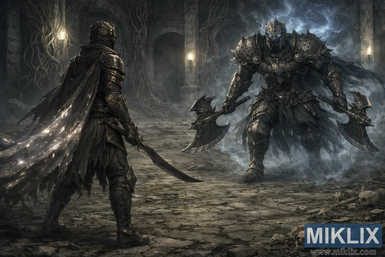 De l’autre côté du sol de pierre brisée, au milieu droit, le Chevalier de la Mort avance avec une délibération terrifiante. L’armure du chevalier est massive et corrodée, sa surface parsemée de bosses, de creux et de protubérances barbelées qui suggèrent des siècles de décomposition. À l’intérieur de la visière sombre du casque, deux yeux bleus froids brillaient, la seule trace de vie dans la coquille massive. Les deux bras du chevalier sont tendus, chacun tenant une hache lourde et brutale. Les armes jumelles pendent légèrement vers l’extérieur, les lames inclinées vers le bas, promettant une puissance dévastatrice dès le premier pas. Une brume bleu pâle s’enroule constamment autour des jambes et des épaules du Chevalier de la Mort, s’enflammant parfois de faibles arcs d’énergie spectrale qui illuminent les os et les décombres à proximité.
