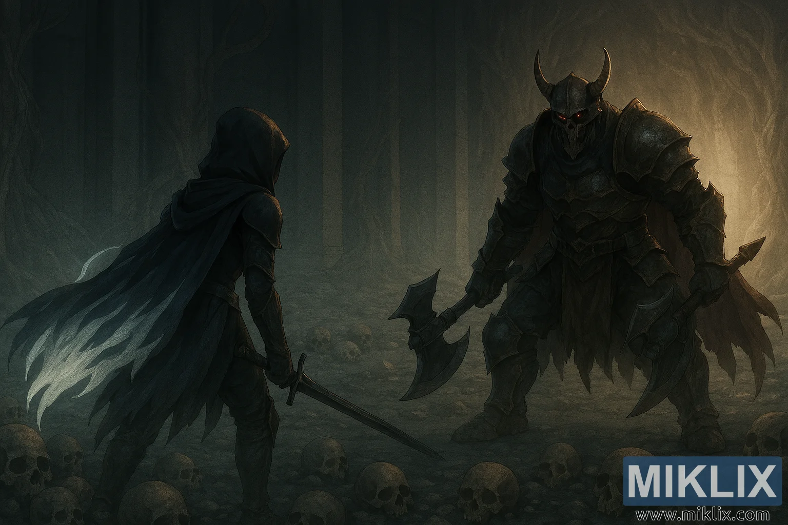 En face de lui, le Chevalier de la Mort se dresse comme une figure imposante aux cornes, vêtue d’une armure dentelée et ternie, ornée de bordures dorées et de plaques superposées. Son casque ressemble à un crâne couronné, avec des yeux rouges brillants perçant la pénombre. Une cape rouge foncé en lambeaux pend de ses épaules, et dans chaque main il manie une immense hache de guerre à deux têtes, leurs lames usées et tachées de sang. Sa posture est large et agressive, genoux pliés et haches levées, prêt à frapper.