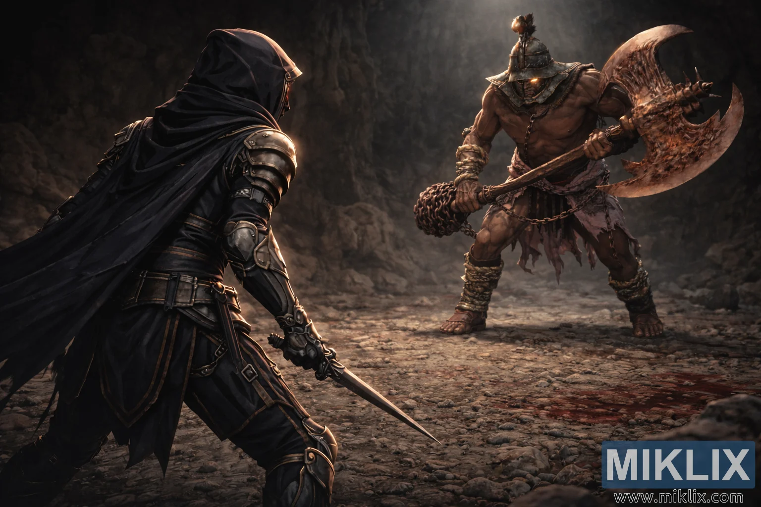 La caverne elle-même est autant un personnage que les guerriers. Le sol est inégal et granuleux, parsemé de cailloux, de morceaux de tissu déchiré et de taches de sang sombres et séchées de victimes précédentes. Les parois rocheuses se rétractent dans une brume d’ombre et de brume, leurs surfaces rugueuses et humides ne captant que les plus faibles lueurs. Des flèches pâles descendent de fissures invisibles au-dessus, illuminant des particules de poussière flottantes qui flottent dans l’air comme un souffle suspendu. Cette lumière tamisée sculpte des silhouettes nettes autour des deux silhouettes, délimitant les bords des armes, les chaînes et les armes tout en laissant les profondeurs environnantes dans une quasi-obscurité.