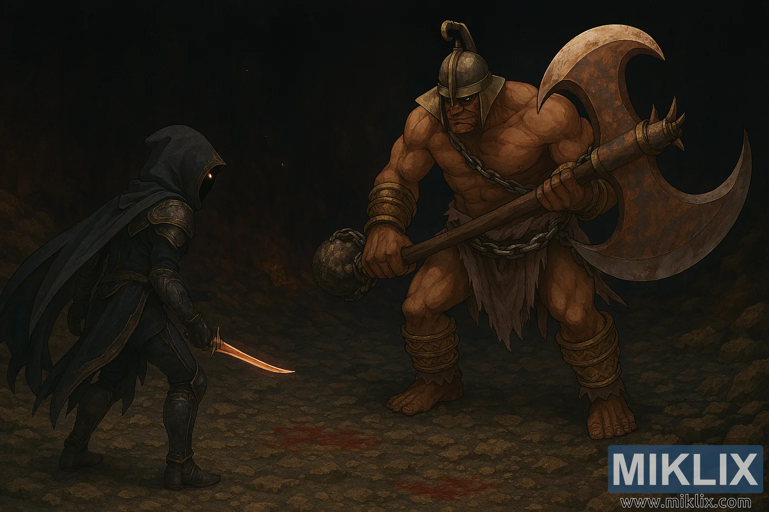 En face du Sans-Éclat se dresse le Duelliste Frénétique, une brute imposante de muscles bruts et de fureur. Sa peau est coriace et bronzée, tendue sur des muscles saillants. Un casque métallique avec une crête haute et pointue et des fentes étroites pour les yeux dissimule son visage, lui donnant une présence menaçante et sans visage. Des chaînes s’enroulent autour de son poignet droit et de son torse, et un poids semblable à une kettlebell pend de son bras. Sa taille est recouverte d’un pagne blanc en lambeaux, et de larges bandes dorées entourent ses jambes et ses bras, attachées par des chaînes supplémentaires. Pieds nus s’agrippent au sol rocheux, et dans sa main droite il brandit une immense hache de guerre à deux branches avec une lame rouillée et usée. Le long manche en bois de la hache est enveloppé dans une chaîne, soulignant la force brutale nécessaire pour la manier.