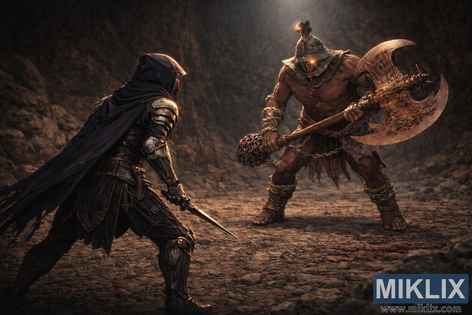 Avec la caméra reculée, l’environnement s’impose plus clairement. Le sol rocheux s’étend autour des combattants, jonché de gravier, de pierres brisées et de taches de sang étalées qui parlent de victimes passées. Les parois irrégulières des grottes s’élèvent derrière eux, leurs surfaces inégales glissantes d’humidité et captant de faibles reflets de rayons étroits filtrant par des ouvertures invisibles au-dessus. Une brume de poussière et de brume flotte entre les deux silhouettes, adoucissant les bords de la caverne et donnant à toute la scène une atmosphère souterraine et étouffante.