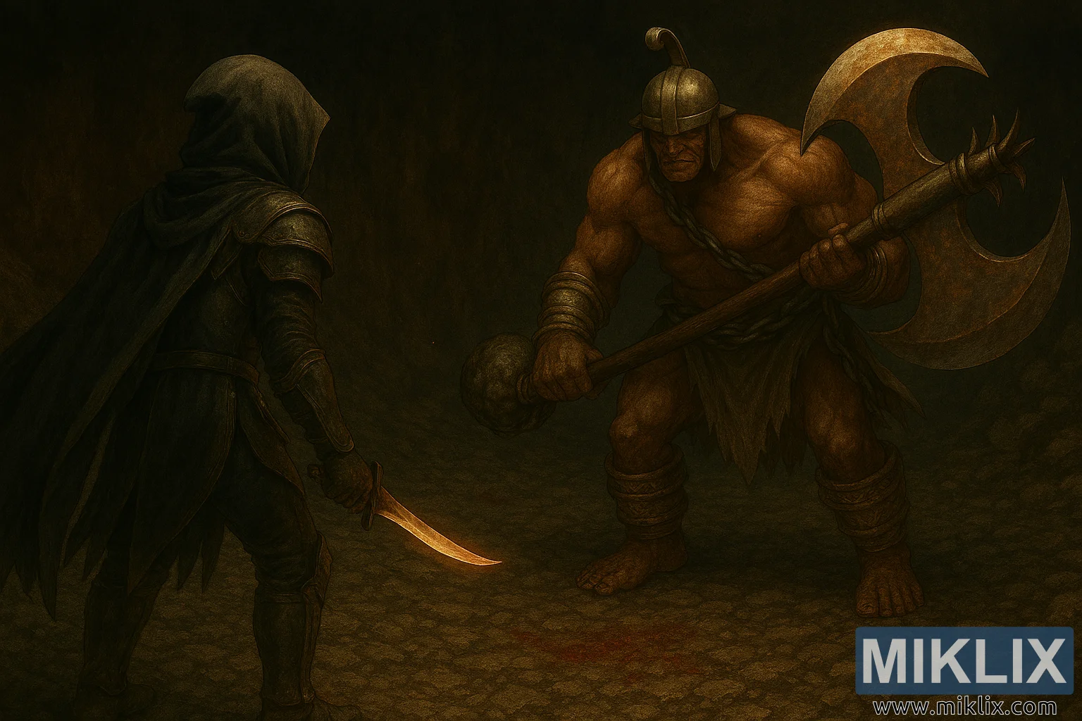En face se tient le Duelliste Frénétique, une brute imposante de muscles bruts et de menace. Sa peau est coriace et bronzée, avec des veines visibles et une texture usée. Il porte un casque en bronze avec une crête centrale et un finial arrondi, projetant une ombre sur son front sévère et froncé. Une grosse chaîne s’enroule autour de son torse et de son poignet droit, avec une boule de fer à pointes pendante de sa main gauche. Sa taille est recouverte d’un pagne en lambeaux et sale, et de grosses bandes dorées entourent ses jambes et ses bras, attachées par des chaînes supplémentaires. Ses pieds nus sont fermement plantés sur le sol rocheux, et de sa main droite, il tient une immense hache de guerre à deux bras avec une lame rouillée et usée. Le long manche en bois de la hache est enveloppé dans une chaîne, soulignant la force brutale nécessaire pour la manier.