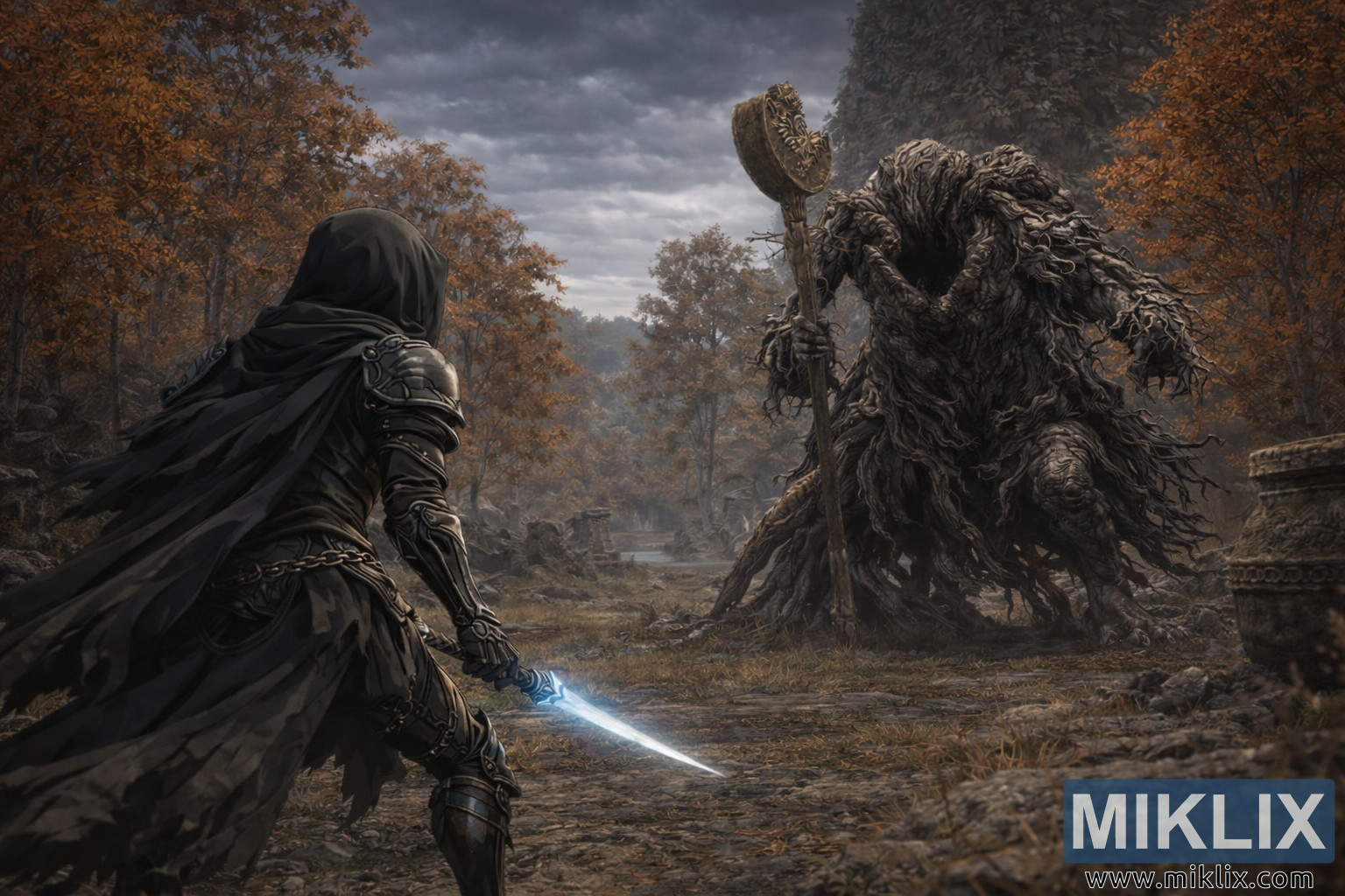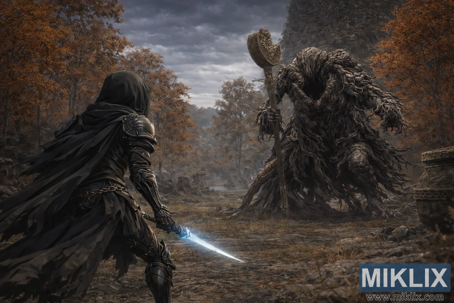 Des détails subtils enrichissent le récit : la posture du joueur est basse et délibérée, suggérant une approche tactique plutôt qu’une force brute; le bâton de l’Avatar de l’Arbre-Monde est légèrement incliné vers l’avant, prêt à déchaîner ses attaques de zone dévastatrices. Le filigrane « MIKLIX » dans le coin inférieur droit, ainsi que le site web « www.miklix.com », identifient l’artiste et ajoutent une touche professionnelle à la présentation.