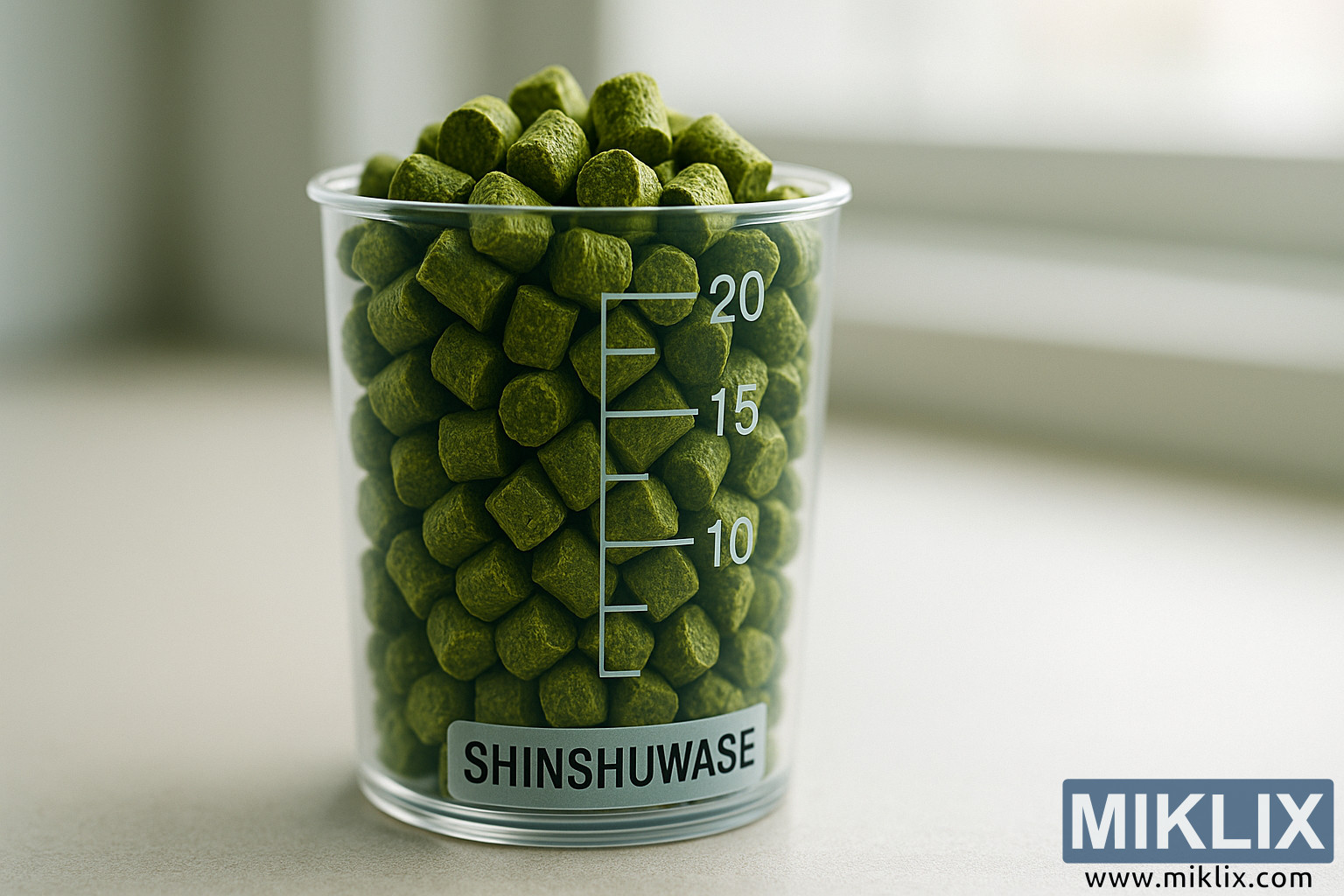 Gros plan haute résolution d'une coupelle doseuse graduée remplie de granulés de houblon Shinshuwase, mise en valeur par la lumière naturelle et un fond minimaliste.