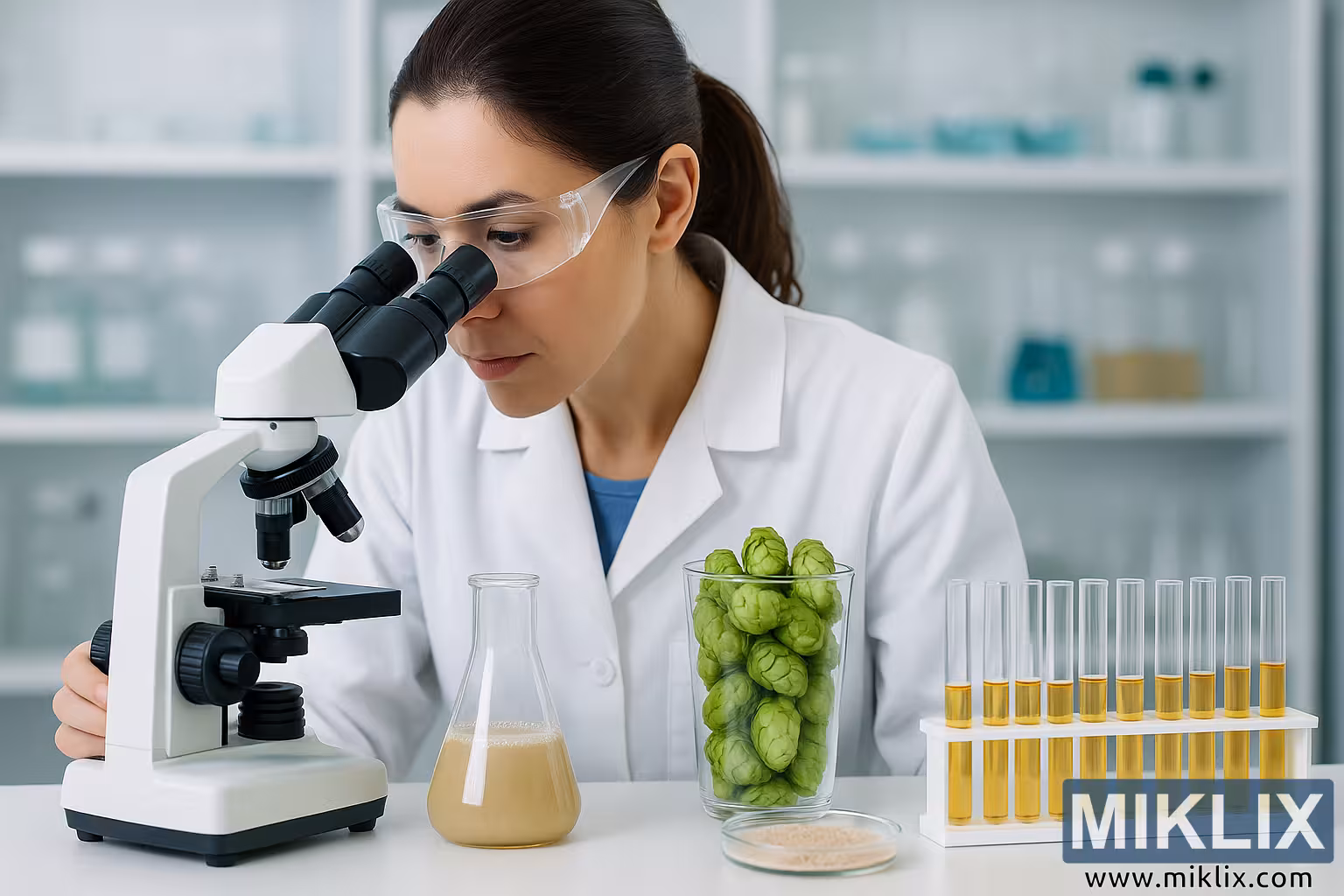 Devant la scientifique, à portée de main, se trouve un erlenmeyer en verre évasé contenant un liquide beige trouble – probablement une suspension de levures ou une culture en fermentation. La consistance et la légère opacité du liquide suggèrent des processus biologiques actifs, peut-être liés à une phase précoce ou intermédiaire de la croissance des levures. À sa droite, soigneusement disposés dans un récipient en verre transparent, se trouvent des cônes de houblon frais et verts. Leur couleur vive et leur texture dense et stratifiée contrastent fortement avec la palette neutre du laboratoire, soulignant leur importance dans l'étude. Le houblon semble avoir été récolté récemment, sans brunissement ni dessèchement visibles, ce qui indique qu'il est utilisé pour une analyse immédiate.