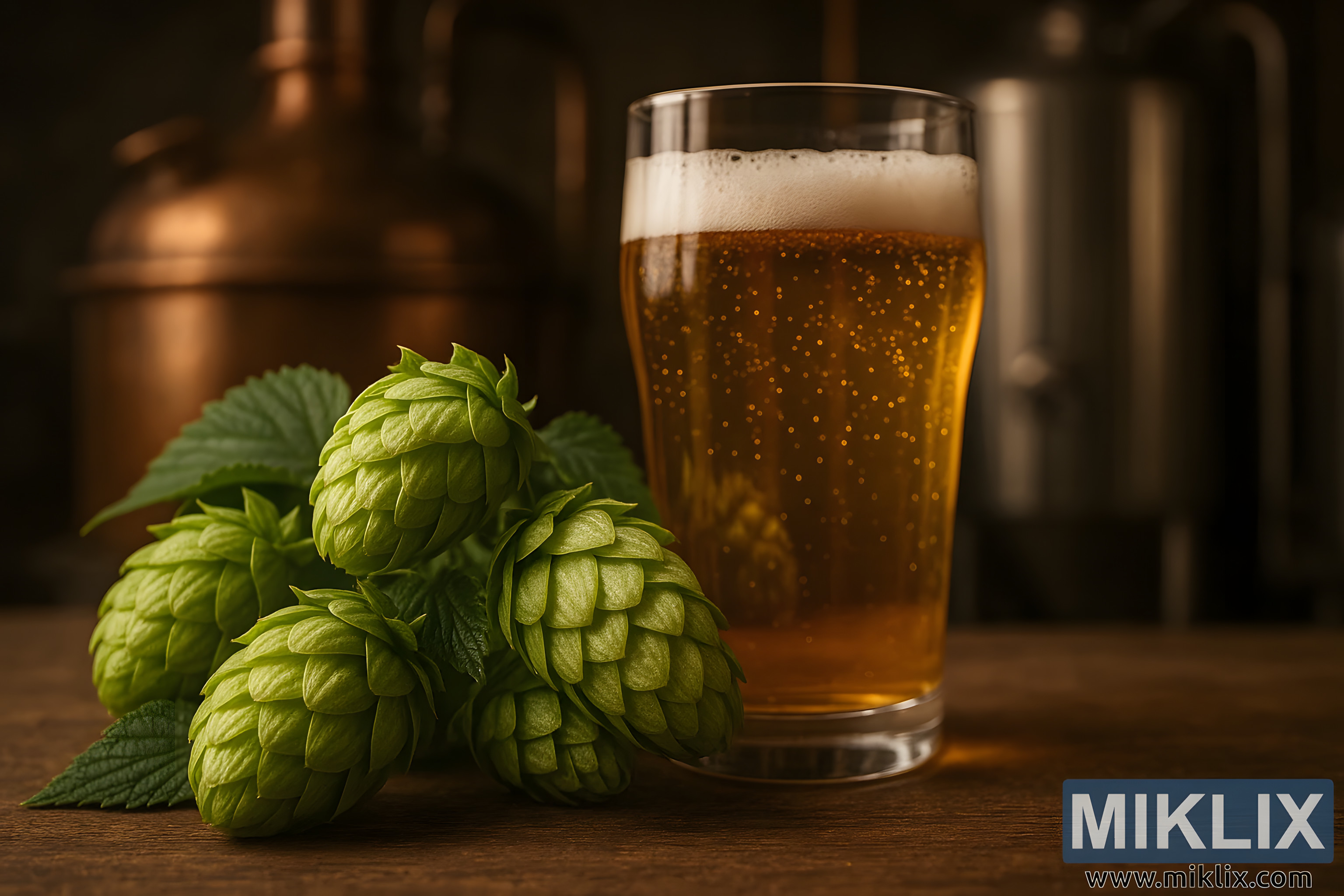 Houblons Spalter Select présentés avec un verre de bière dorée et du matériel de brassage, mettant en valeur l'harmonie des houblons haut de gamme et du savoir-faire brassicole artisanal.