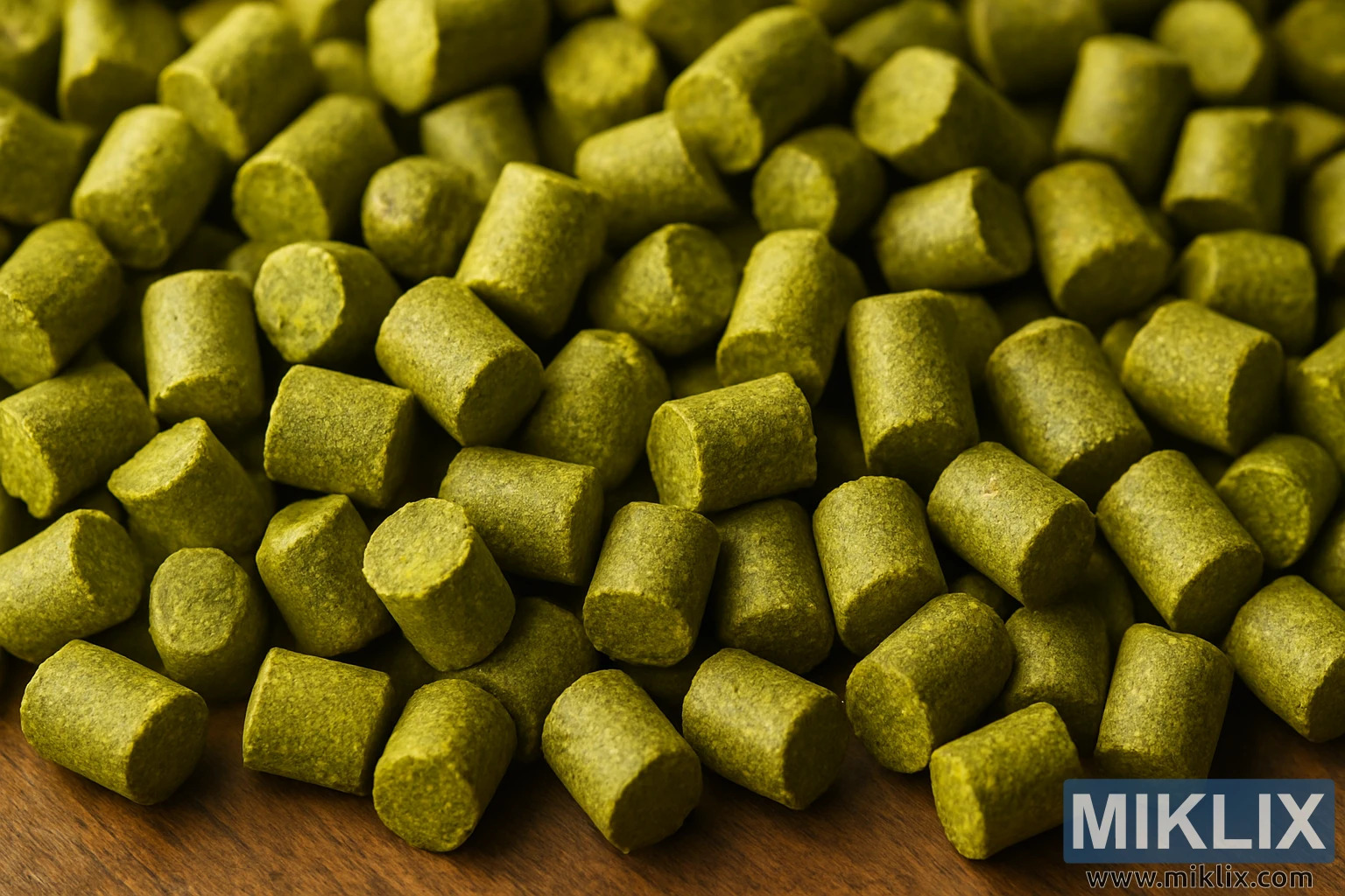 Vue macro détaillée des pellets de houblon Tahoma sur une table en bois rustique. Les cylindres d'un vert éclatant, chaleureusement éclairés latéralement, révèlent leur texture dense et leurs qualités de brassage.