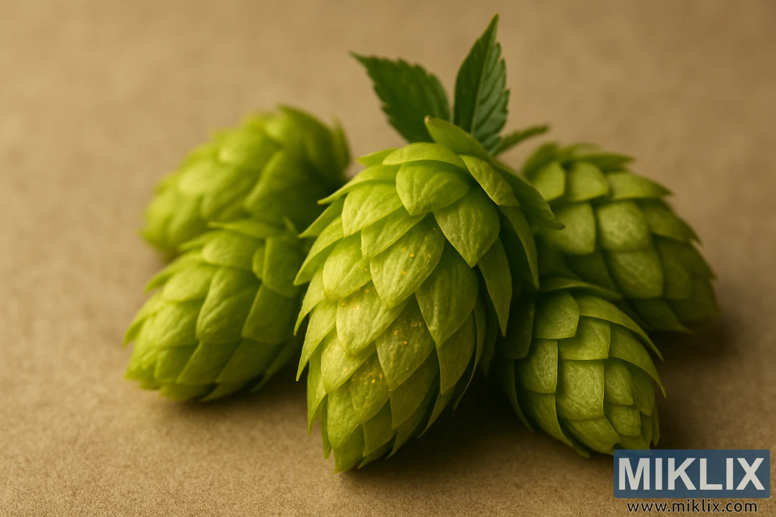 La photographie présente un gros plan saisissant de cônes de houblon Tahoma fraîchement récoltés, soigneusement disposés sur un fond neutre et texturé. Regroupés au premier plan, les cônes attirent immédiatement le regard par leur couleur verte naturelle et vibrante et leurs bractées étagées complexes. Chaque cône est capturé avec une netteté remarquable, révélant les structures squameuses superposées qui caractérisent la morphologie du houblon. De subtils reflets sur les cônes soulignent leur forme tridimensionnelle, tandis que les jeux d'ombres et de lumière révèlent de délicates variations de texture.