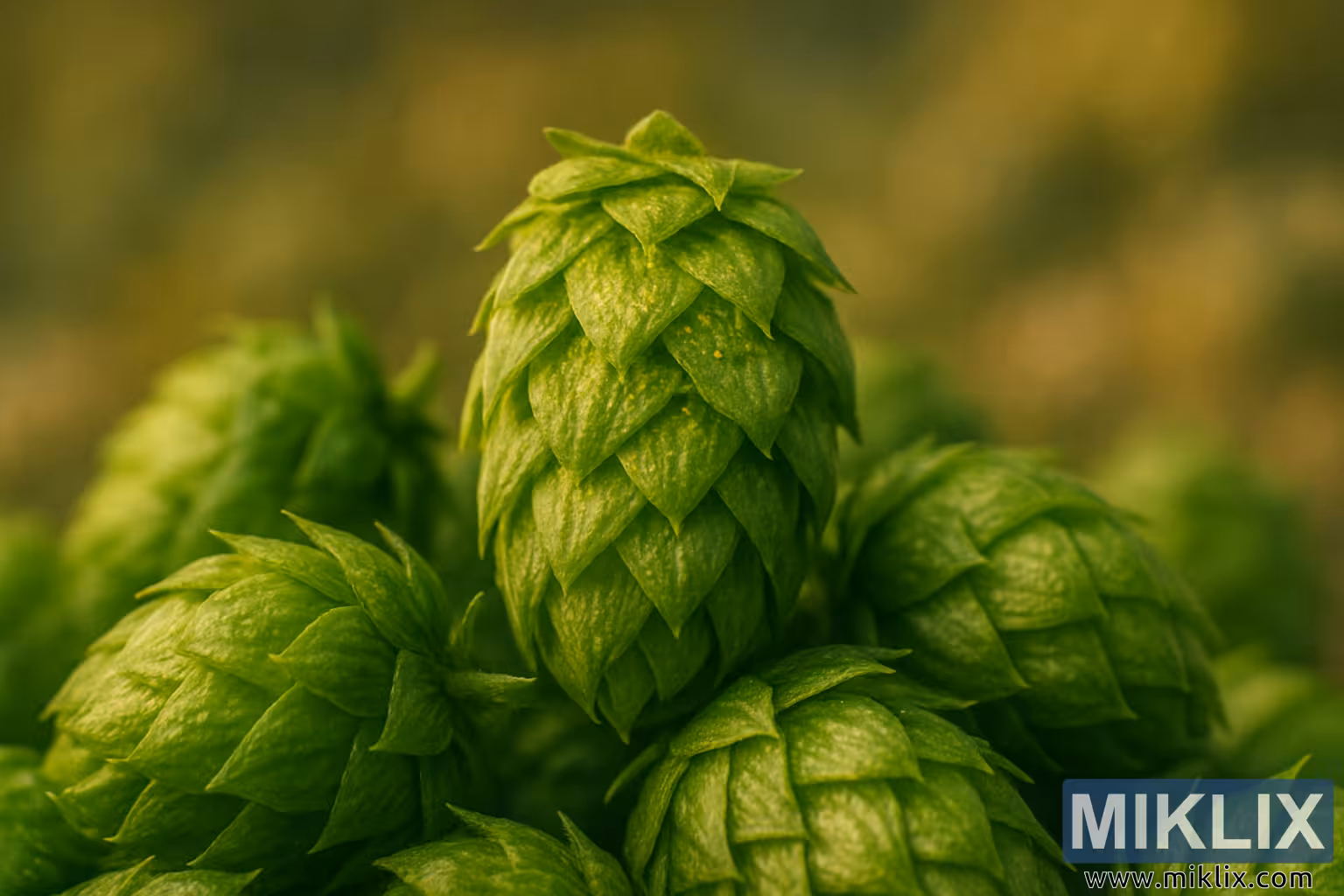 L'éclairage doux et chaleureux accentue l'intensité des teintes vertes, baignant les cônes d'un éclat naturel qui accentue à la fois texture et profondeur. Le jeu d'ombres et de lumières crée un contraste dynamique qui attire le regard vers le cône central, tandis que les cônes environnants apportent contexte et richesse au cadre. L'arrière-plan flou, rendu dans des tons brun doré et olive discrets, offre une toile de fond picturale, évoquant une atmosphère naturelle rappelant les champs et les moissons. Cette faible profondeur de champ délibérée transmet à la fois intimité et grandeur : intimité grâce aux détails minutieux des cônes, et grandeur grâce à la suggestion d'une vaste houblonnière brumeuse juste derrière l'objectif.