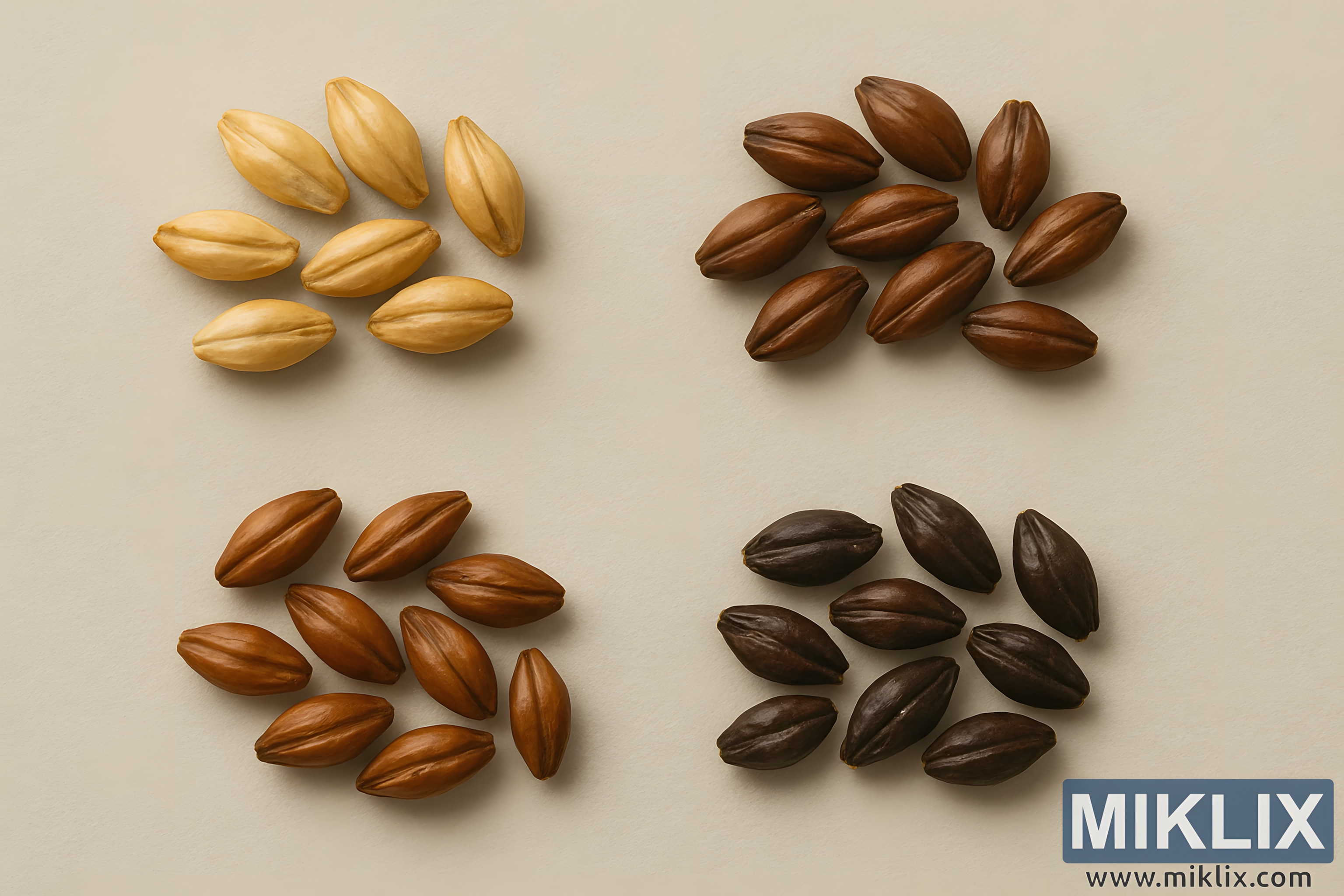 Sur un fond doux et neutre évoquant la précision sereine d'un laboratoire ou d'une salle de dégustation, quatre groupes distincts de grains maltés sont disposés avec un soin méthodique, chaque groupe formant un quadrant visuel dans une grille 2x2. L'éclairage, vif mais doux, projette des ombres subtiles qui mettent en valeur les contours et les textures des grains sans occulter leurs teintes naturelles. Cette composition est conçue non seulement pour son esthétique, mais aussi pour la clarté analytique – une étude de la diversité des malts qui invite à une observation attentive et à une comparaison approfondie.