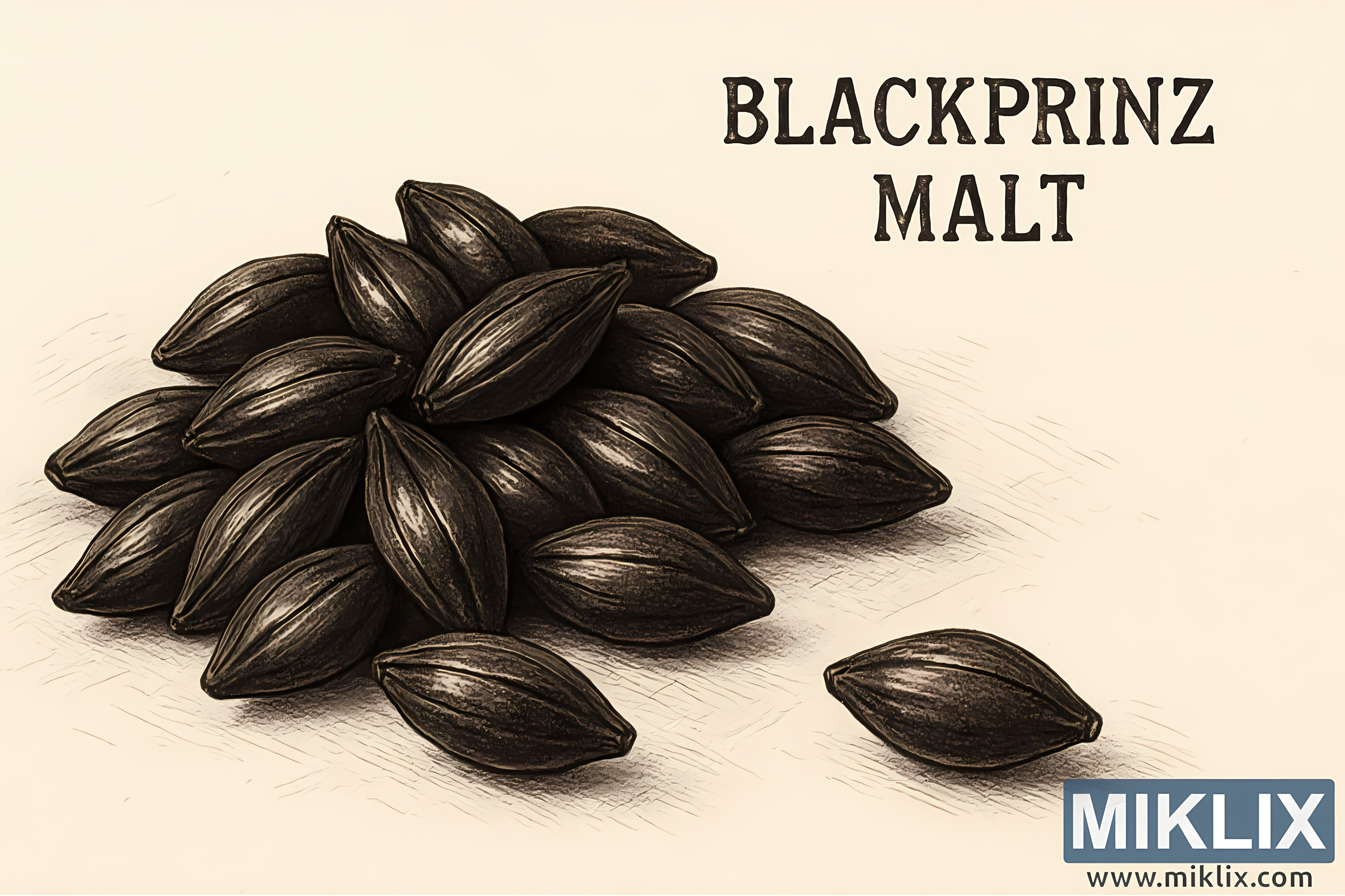 Plus qu'une illustration technique, c'est le portrait d'un ingrédient doté d'une personnalité et d'un objectif précis. Le malt Blackprinz est souvent utilisé pour ajuster la couleur des bières sans en altérer la saveur de manière trop marquée, ce qui en fait un choix idéal pour les brasseurs en quête d'équilibre et de subtilité. Son caractère torréfié net lui permet de sublimer les stouts, les porters et les lagers brunes sans introduire les notes âcres propres aux malts plus fortement torréfiés. L'image illustre cette dualité : l'intensité visuelle des grains noirs contrastant avec la promesse d'une saveur onctueuse et raffinée.