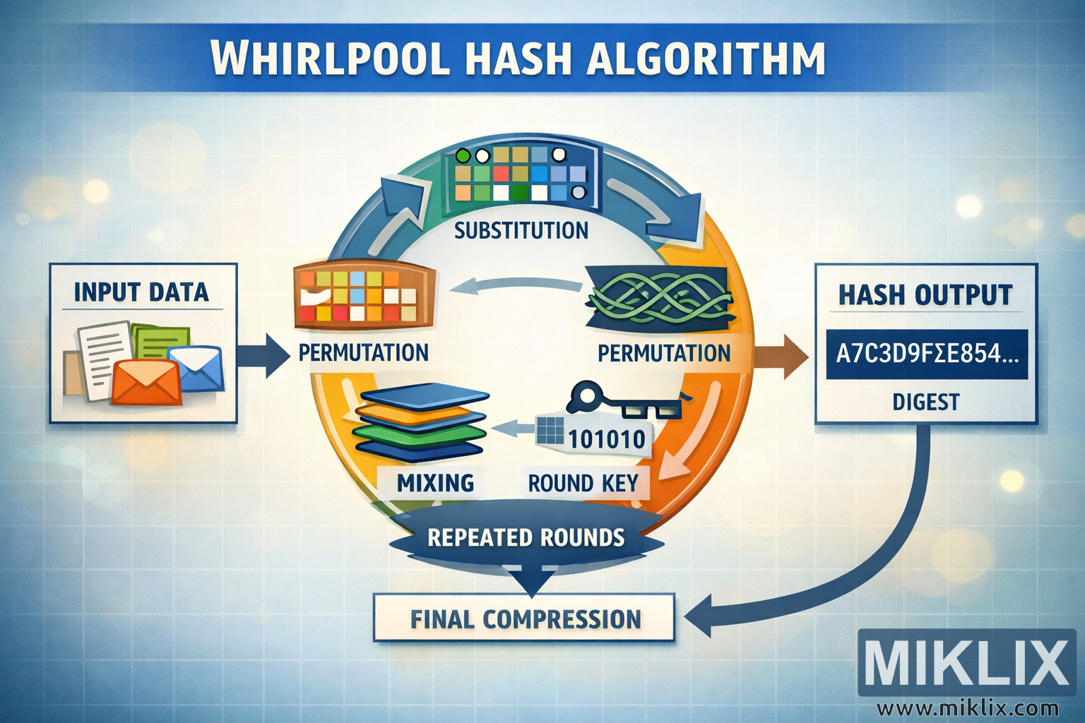 Infographie paysagère haute résolution expliquant l'algorithme de hachage Whirlpool avec des étapes clairement étiquetées telles que la substitution, la permutation, le mélange, les clés de tour, les tours répétés et la compression finale.