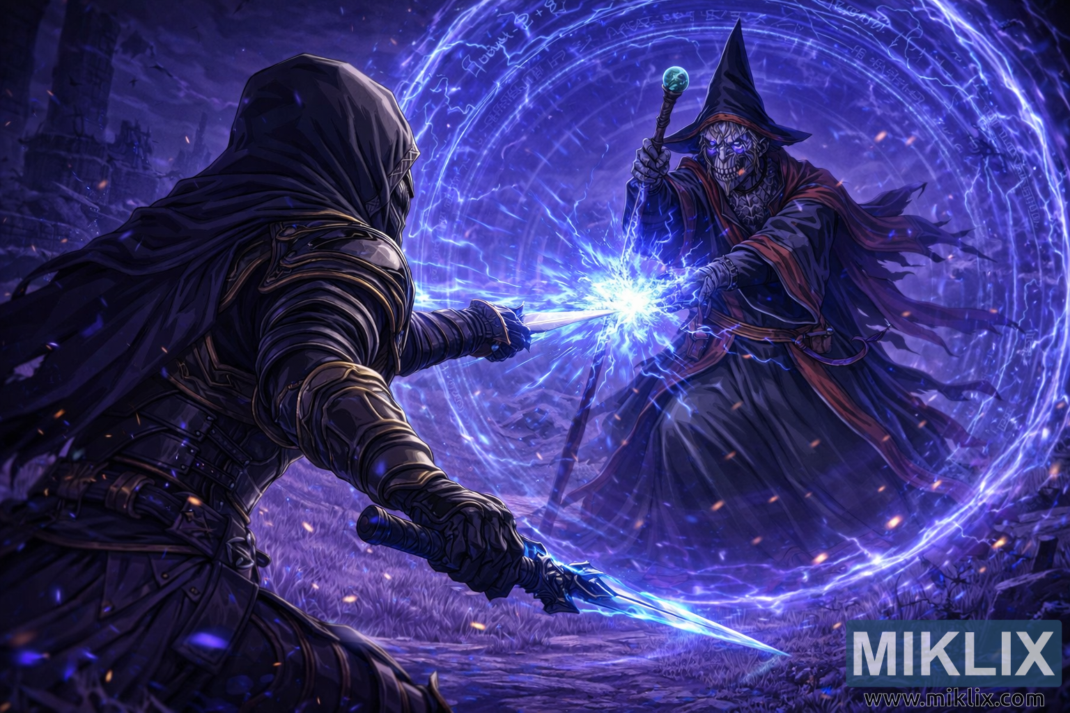 Au second plan se dresse le Mage de Bataille Hugues, suspendu au-dessus des herbes violettes fantomatiques. Son visage squelettique émerge d'un haut chapeau de magicien tordu, ses yeux creux illuminés par les reflets du sort qu'il déchaîne. Sa main gauche libère une violente énergie céruléenne, la magie percutant de plein fouet la lame du Terni, au centre de la composition. Sa main droite serre un bâton surmonté d'un orbe à la douce lueur, canalisant l'immense puissance qui rayonne. Derrière lui, un immense cercle de runes bleues tournoie dans les airs, ses anneaux concentriques gravés de symboles arcaniques qui se fondent en lumière au gré de leur rotation.