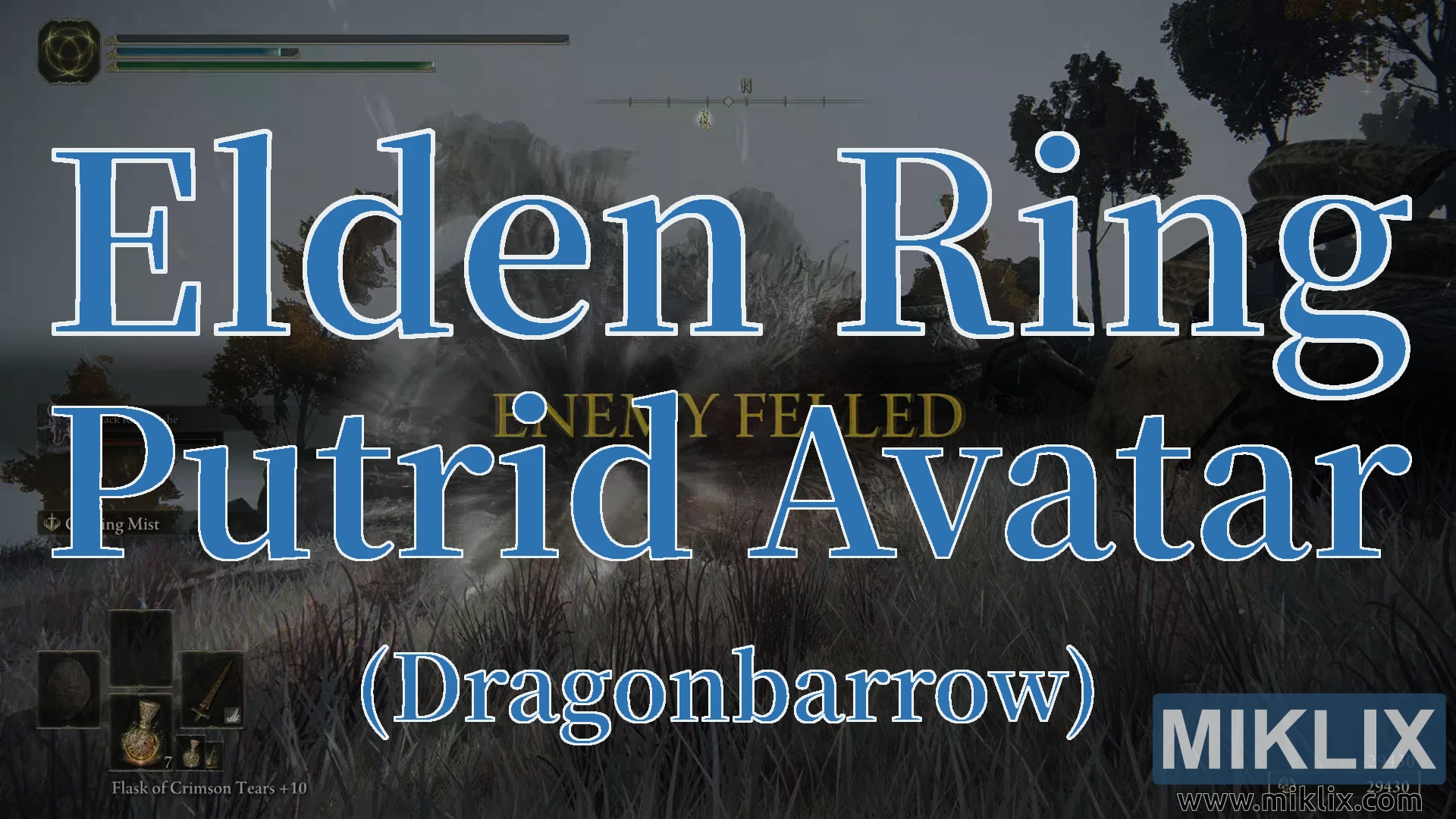 L'Avatar putride fait partie du niveau le plus bas des boss d'Elden Ring, les boss de terrain. On le trouve en extérieur, gardant l'Arbre-Erd mineur à Dragonbarrow. Comme la plupart des boss mineurs du jeu, celui-ci est optionnel : il n'est pas nécessaire de le vaincre pour progresser dans l'histoire principale.