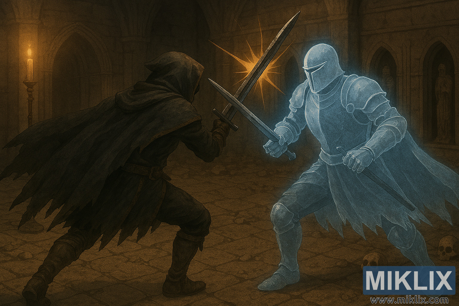 Face à lui se dresse le Chevalier de la Prison Solitaire, d'une teinte bleue translucide et lumineuse qui évoque sa nature fantomatique. Son armure, finement détaillée et semi-transparente, est coiffée d'un casque lisse et sans ornement, dépourvu de toute plume ou décoration. Le chevalier irradie une énergie éthérée, et sa grande épée brille de la même lumière spectrale. Il la tient à deux mains, inclinée vers le bas, lorsqu'elle s'entrechoque avec la lame du Terni, produisant une gerbe d'étincelles orangées au point d'impact.