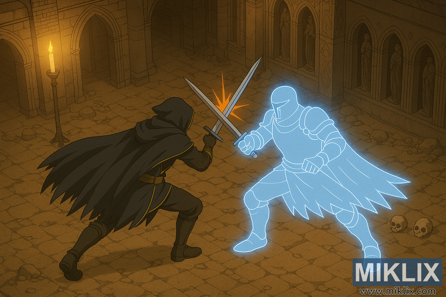 La composition est dynamique et équilibrée, les épées entrecroisées formant un point focal saisissant. Le contraste entre la douce lueur des bougies et la froide lueur spectrale crée une tension visuelle qui reflète l'affrontement des forces physiques et surnaturelles. Les arches en retrait et les statues de personnages drapés à l'arrière-plan ajoutent profondeur et ampleur, attirant le regard du spectateur au cœur du duel.