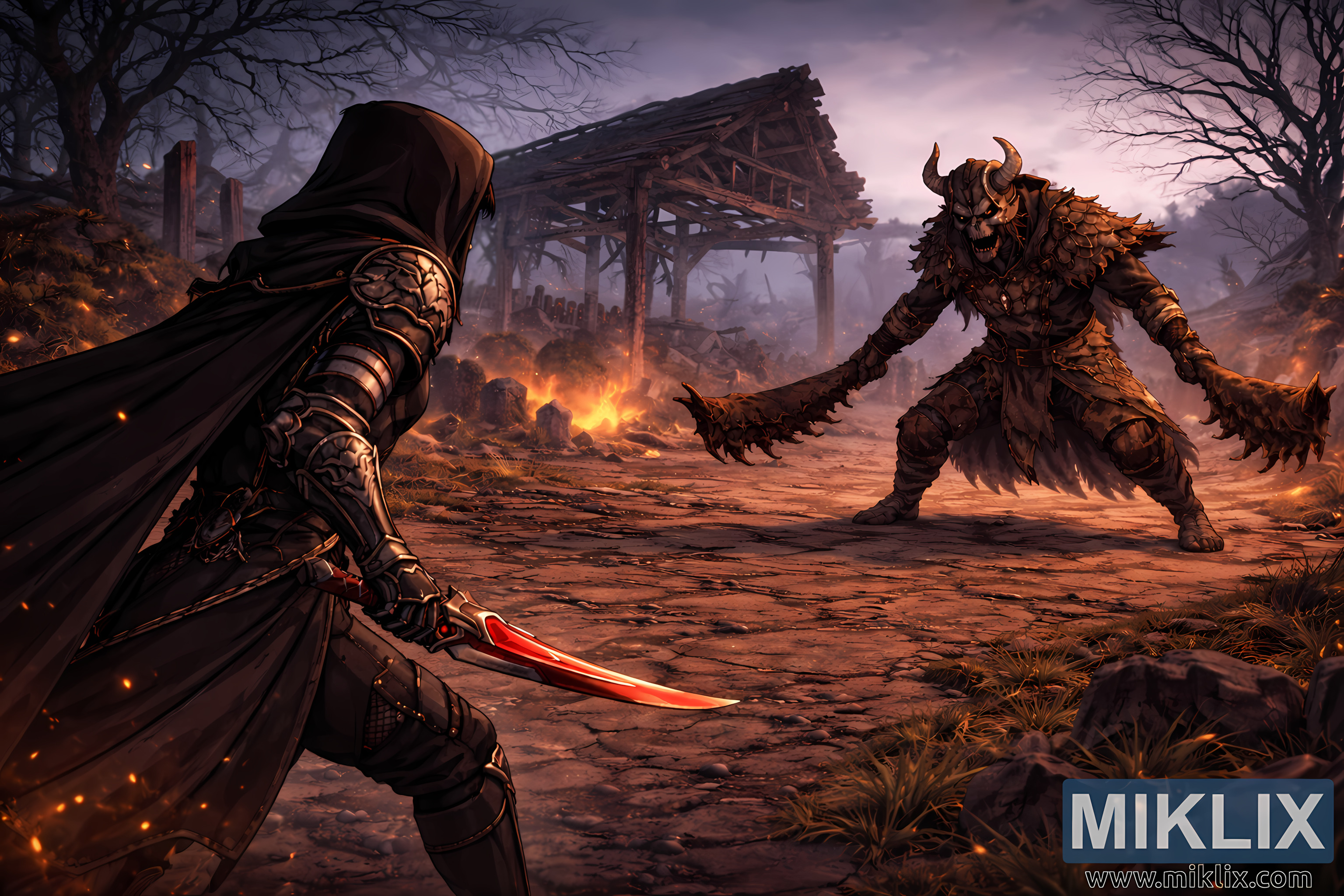 L'arrière-plan élargi enrichit l'atmosphère de la scène. Entre et derrière les deux personnages s'étend une bande de terre craquelée, parsemée de pierres, d'herbes sèches et de braises incandescentes. De petits feux brûlent parmi des pierres tombales brisées et des débris, leur lumière orangée projetant de longues ombres vacillantes. Au second plan, une structure en bois partiellement effondrée, aux poutres apparentes et aux supports affaissés, témoigne de la destruction du village. Plus loin, des arbres tordus et dénudés encadrent la scène, leurs branches squelettiques se perdant dans un ciel brumeux teinté de gris et de pourpre sourd. La fumée et les cendres flottent dans l'air, adoucissant les contours lointains du paysage.