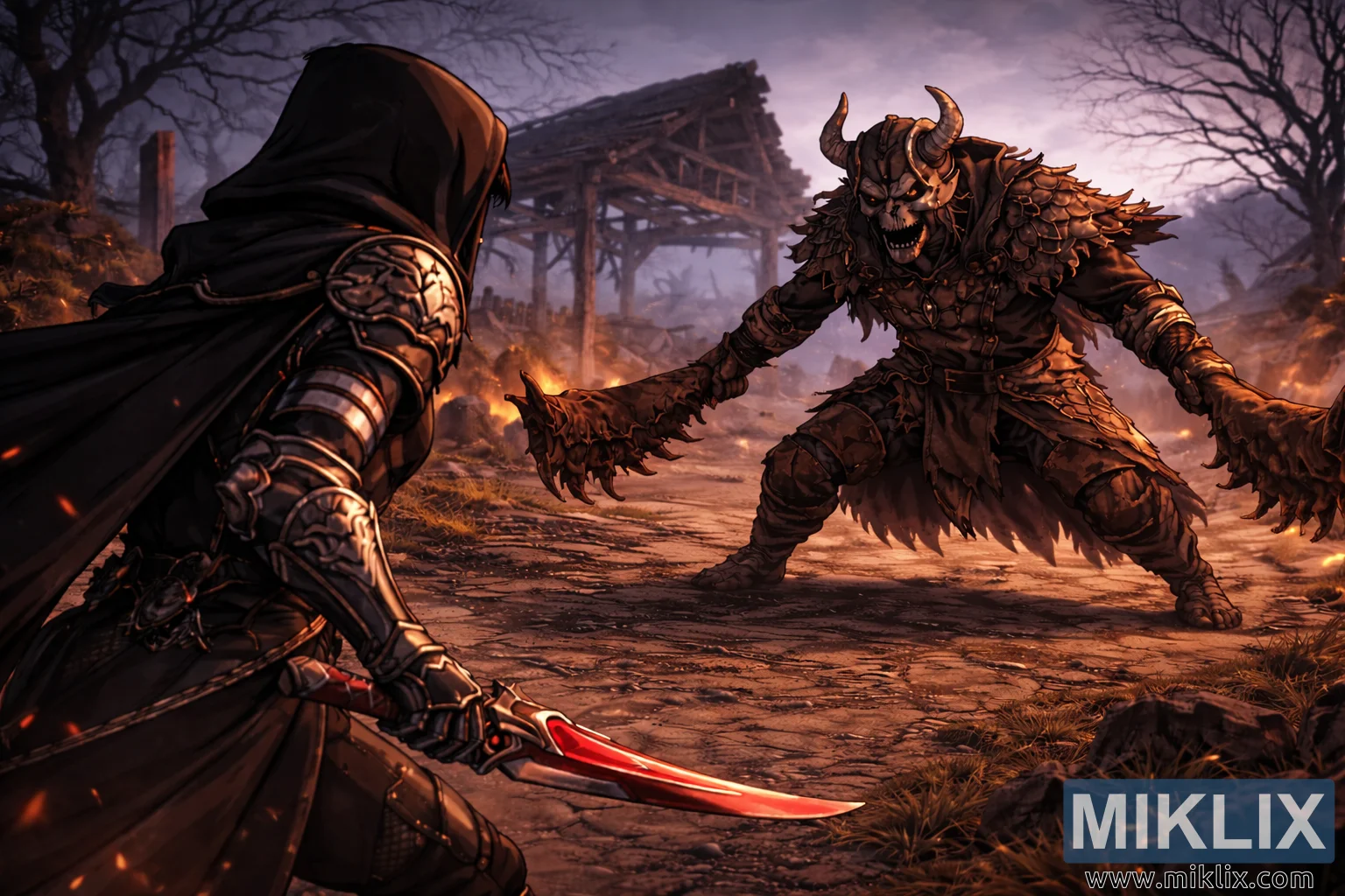 L'environnement accentue la tension croissante. Le sol entre les deux personnages est craquelé et inégal, jonché d'herbes mortes, de pierres et de braises incandescentes qui flottent dans l'air. De petits feux brûlent près de pierres tombales brisées et de débris, leur lueur orangée vacillant sur les armures et les armes. À l'arrière-plan, une structure en bois partiellement effondrée se dresse des ruines, ses poutres apparentes se détachant sur un ciel lourd de brouillard. Des arbres tordus et dénudés encadrent la scène, leurs branches squelettiques s'étirant dans une brume grise et pourpre sourde, tandis que la fumée et les cendres adoucissent les contours lointains du village.