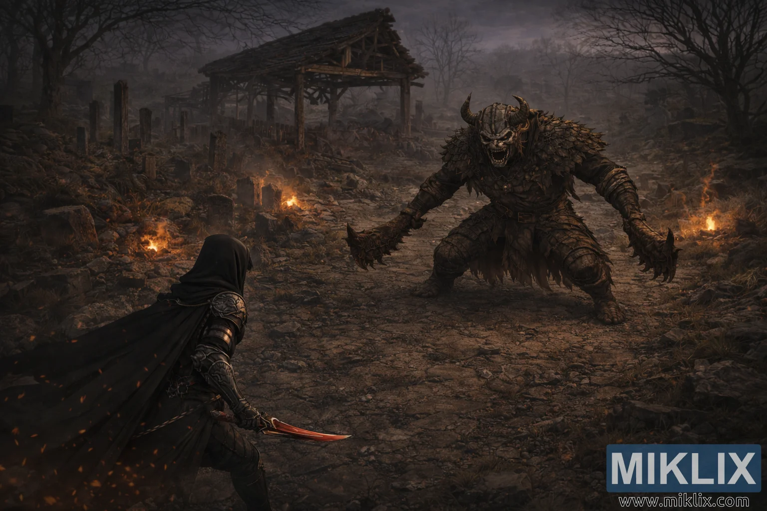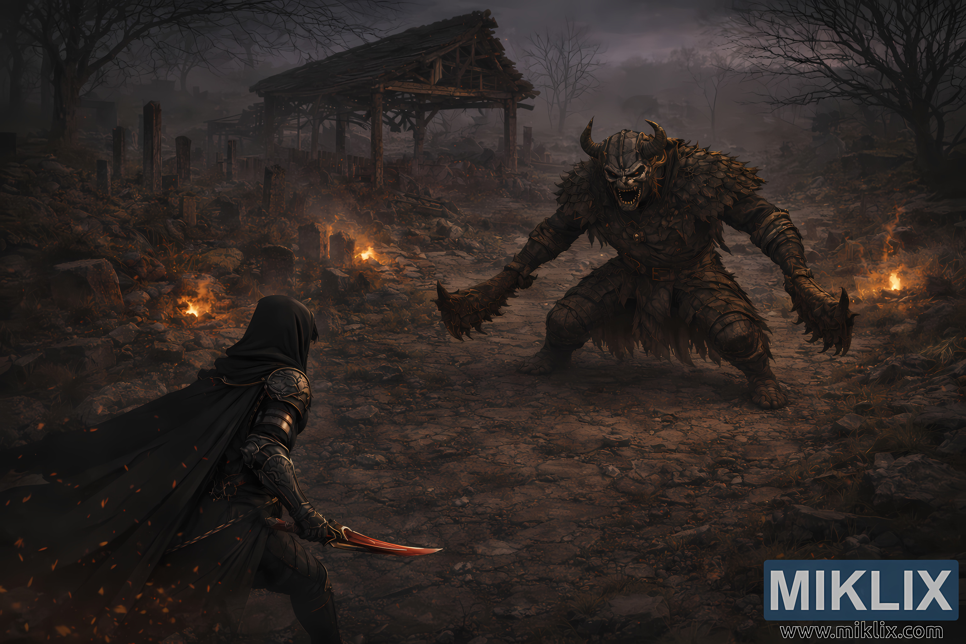 L'environnement occupe une place centrale dans la composition. Le sol entre les deux personnages est craquelé et inégal, jonché de pierres, d'herbes sèches et de cendres. De petits feux brûlent par intermittence le long du chemin, leur lueur orangée vacillant sur la terre gris-brun. Des pierres tombales brisées et des débris jonchent les lieux, évoquant des morts oubliées et des vies depuis longtemps abandonnées. À l'arrière-plan, une structure en bois partiellement effondrée se dresse des ruines, ses poutres apparentes, déformées et éclatées, se détachant sur un ciel chargé de brume. Des arbres tordus et dénudés encadrent le village, leurs branches s'enfonçant dans la brume comme des doigts squelettiques.