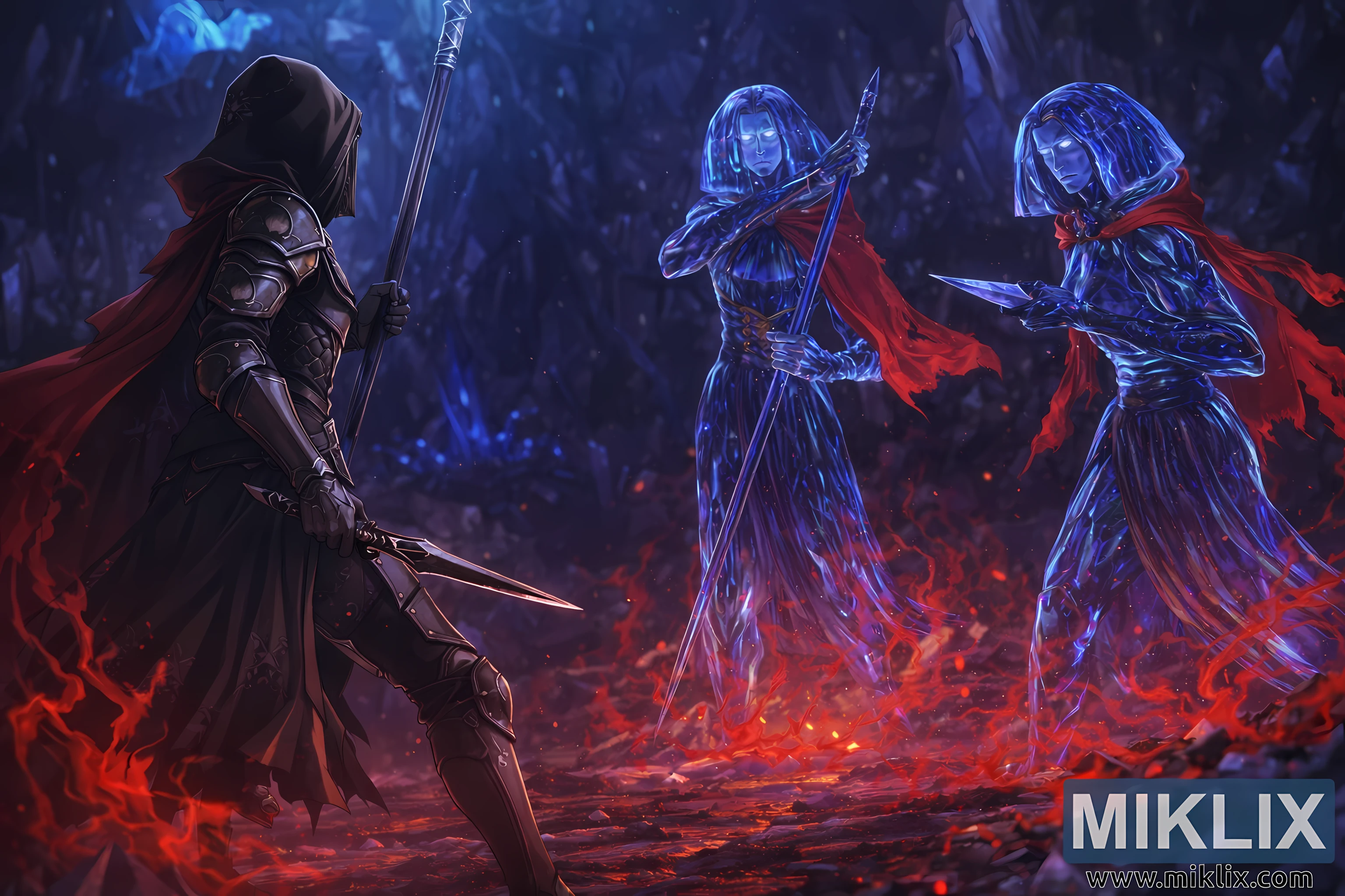 Fan art d'anime en haute résolution représentant l'armure Tarnished in Black Knife affrontant les boss jumeaux Crystaliens à l'intérieur de la grotte de cristal de l'Académie d'Elden Ring, capturée dans un moment tendu avant la bataille.