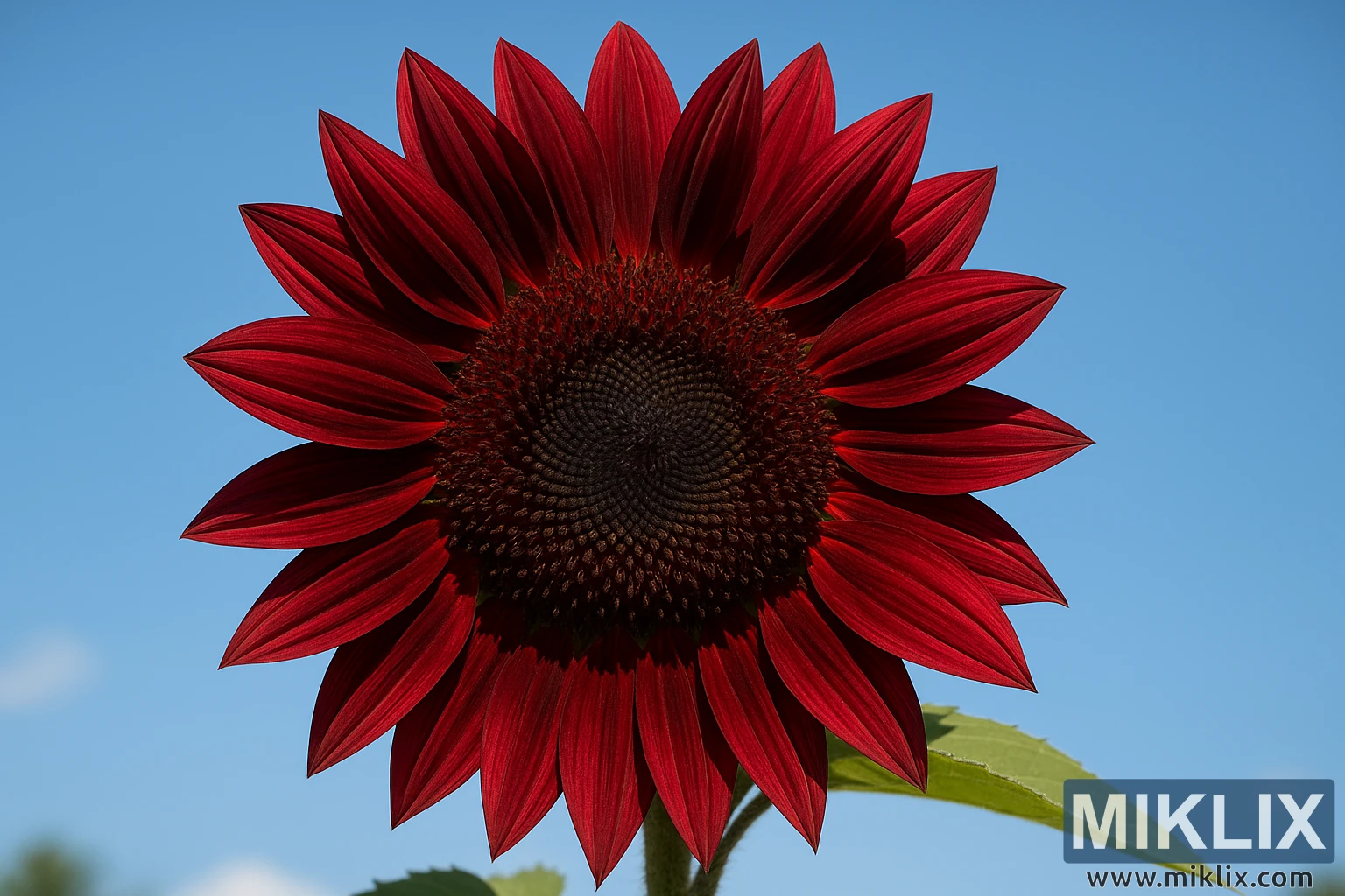 Cette image est un magnifique gros plan haute résolution d'un tournesol Moulin Rouge (Helianthus annuus), l'une des variétés de tournesol les plus saisissantes et visuellement spectaculaires, célèbre pour ses pétales d'un rouge profond et velouté et sa coloration inhabituelle, richement saturée. Prise en pleine floraison sous un ciel d'été clair, la photographie met magnifiquement en valeur le caractère audacieux et l'élégance raffinée de la fleur, la présentant non seulement comme une plante, mais comme une œuvre d'art naturelle. Chaque détail, de la texture complexe du disque central au subtil éclat de chaque pétale, est rendu avec une netteté exceptionnelle, soulignant le charme unique de cette variété ornementale.