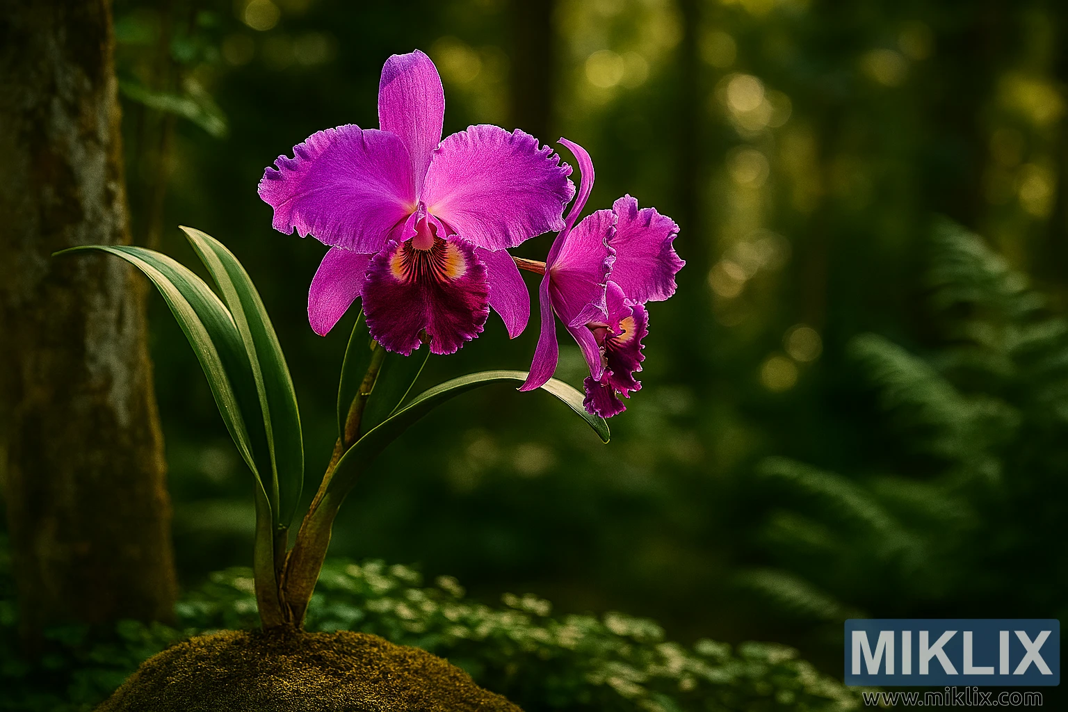 Une magnifique orchidée Cattleya se dresse fièrement dans un jardin forestier, ses grands pétales ondulés s'épanouissant dans des teintes magenta éclatantes sous la douce lumière filtrée du soleil. Réputée pour ses floraisons flamboyantes et son parfum enivrant, la Cattleya est la pièce maîtresse de cette composition sereine, exhalant une élégance botanique et un charme spectaculaire.