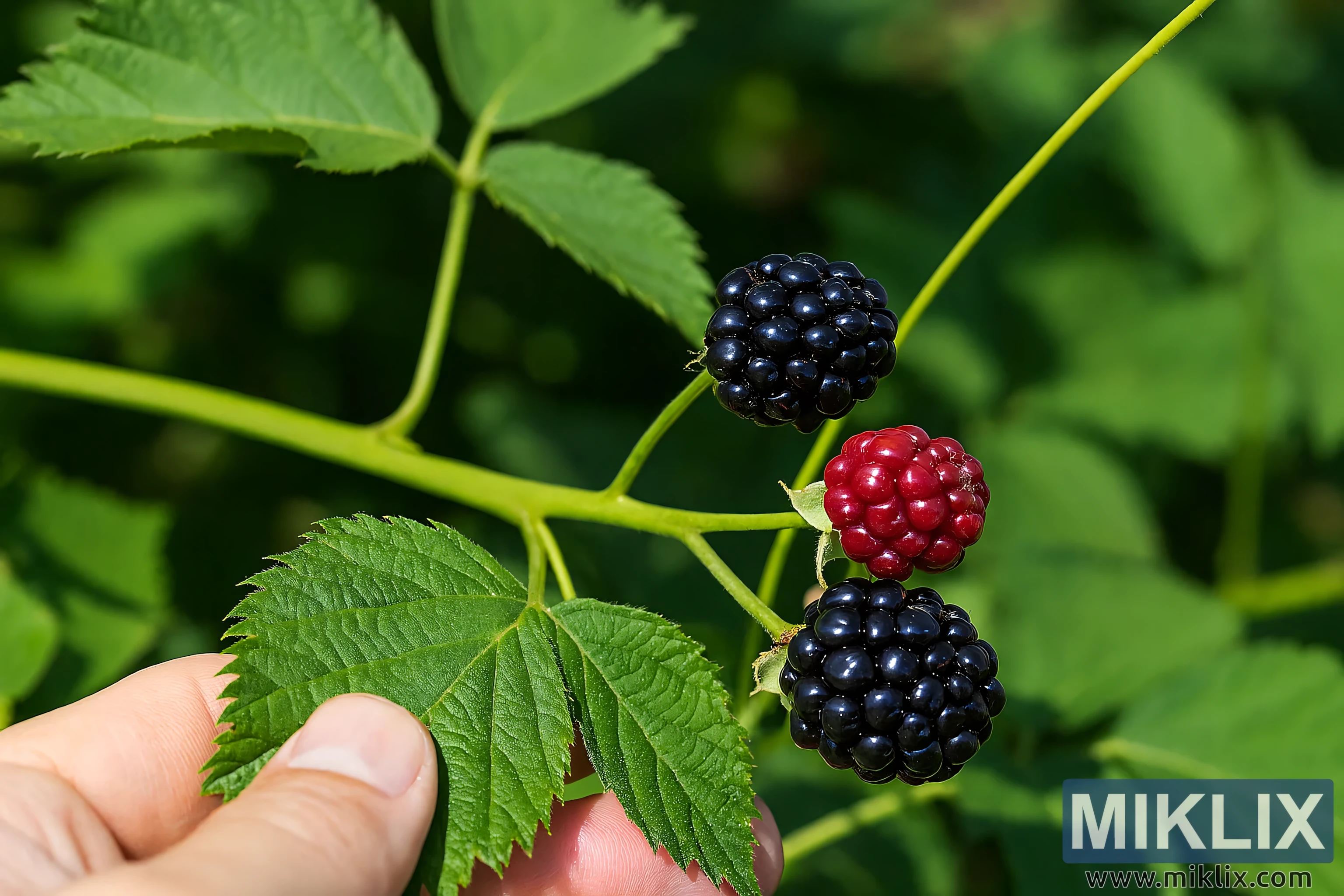 Une main humaine caresse délicatement la plante, tenant une feuille pour révéler la douceur de la tige et l'accessibilité des baies. La main, au teint clair, aux ongles nets et aux plis cutanés subtils, suggère un moment de contemplation ou de soin attentif au jardin. Cette interaction confère une touche personnelle à l'image, soulignant la facilité de manipulation des variétés sans épines.