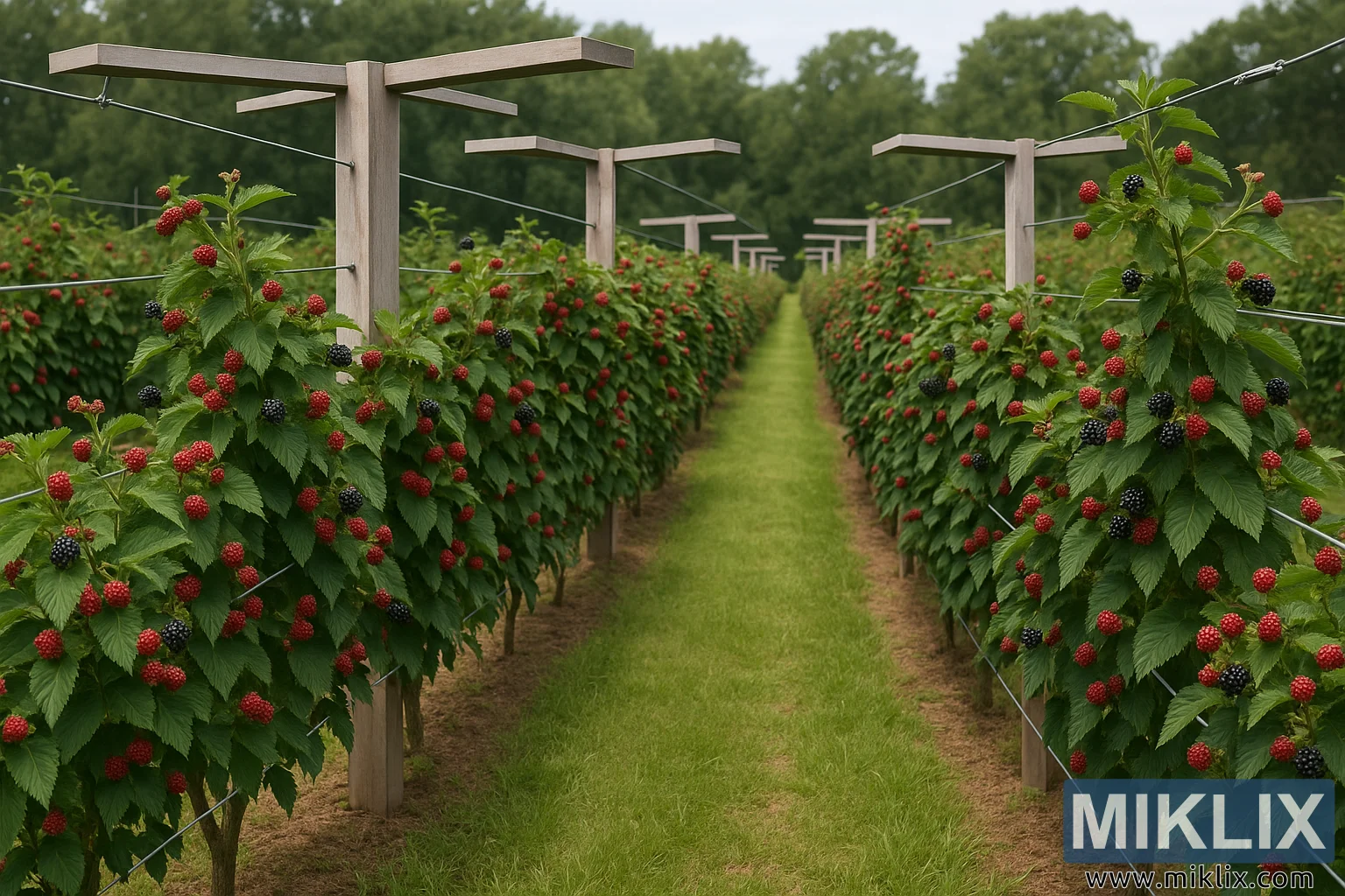 Image : Système de double treillage en T pour la culture des mûres dans un verger bien entretenu