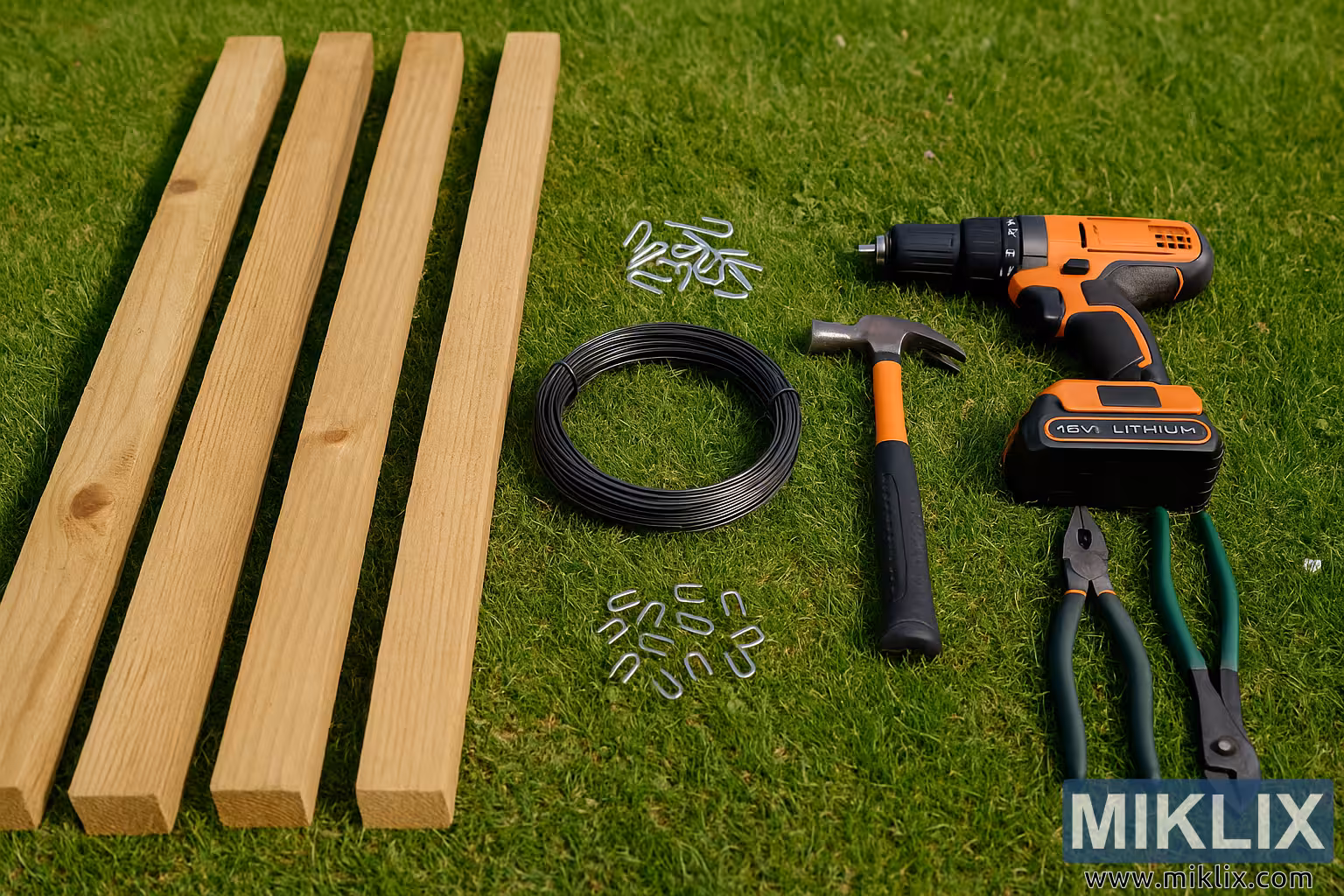 Vue détaillée des matériaux et outils essentiels utilisés pour la construction d'un treillis à mûres, notamment des poteaux en bois, du fil de fer, un marteau, une perceuse et des sécateurs, soigneusement disposés sur une pelouse.