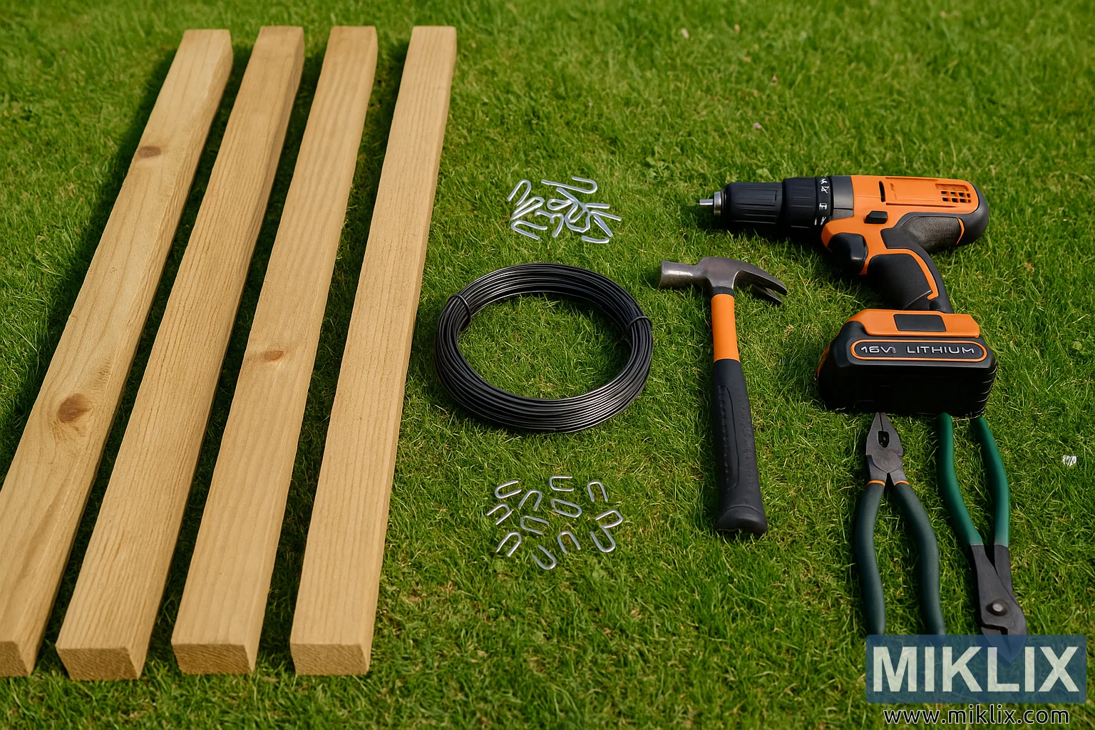 L'image présente un ensemble soigneusement organisé d'outils et de matériaux servant à la construction d'un treillis à mûres, disposés sur un fond d'herbe fraîchement coupée d'un vert éclatant, sous la lumière naturelle. À gauche, quatre poteaux en bois robustes et régulièrement taillés sont positionnés parallèlement les uns aux autres. Le bois, brun clair, présente un grain apparent et quelques nœuds, ce qui laisse supposer qu'il s'agit de bois traité, adapté à un usage extérieur. Les poteaux, lisses et d'équerre, indiquent qu'ils sont destinés à servir de supports verticaux ou de poteaux d'extrémité à la structure du treillis.