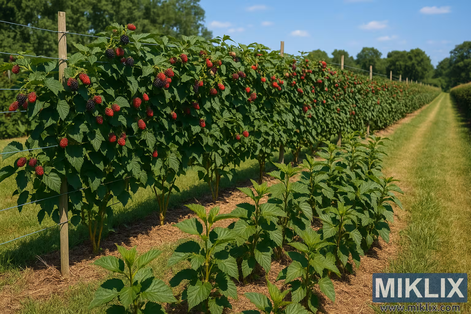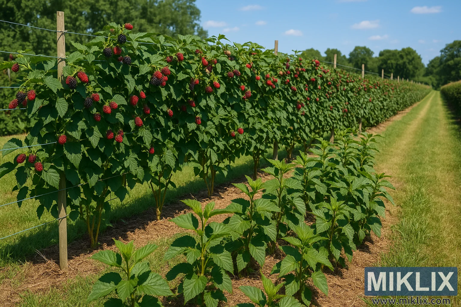 Image haute résolution montrant un système de double culture de mûriers remontants, avec des cannes fructifères matures et de nouvelles pousses végétatives dans un champ agricole bien géré sous un ciel d'été dégagé.