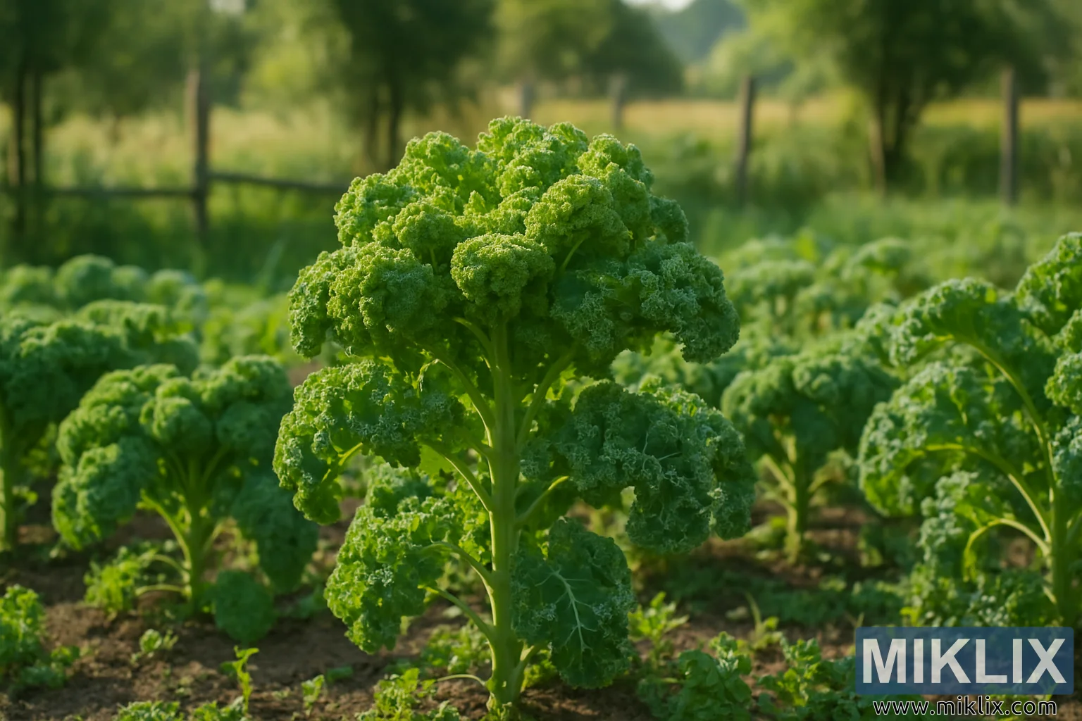 Une magnifique photographie de chou frisé s'épanouissant dans un jardin champêtre serein, avec ses feuilles d'un vert éclatant illuminées par la douce lumière du matin et une clôture en bois rustique au loin.