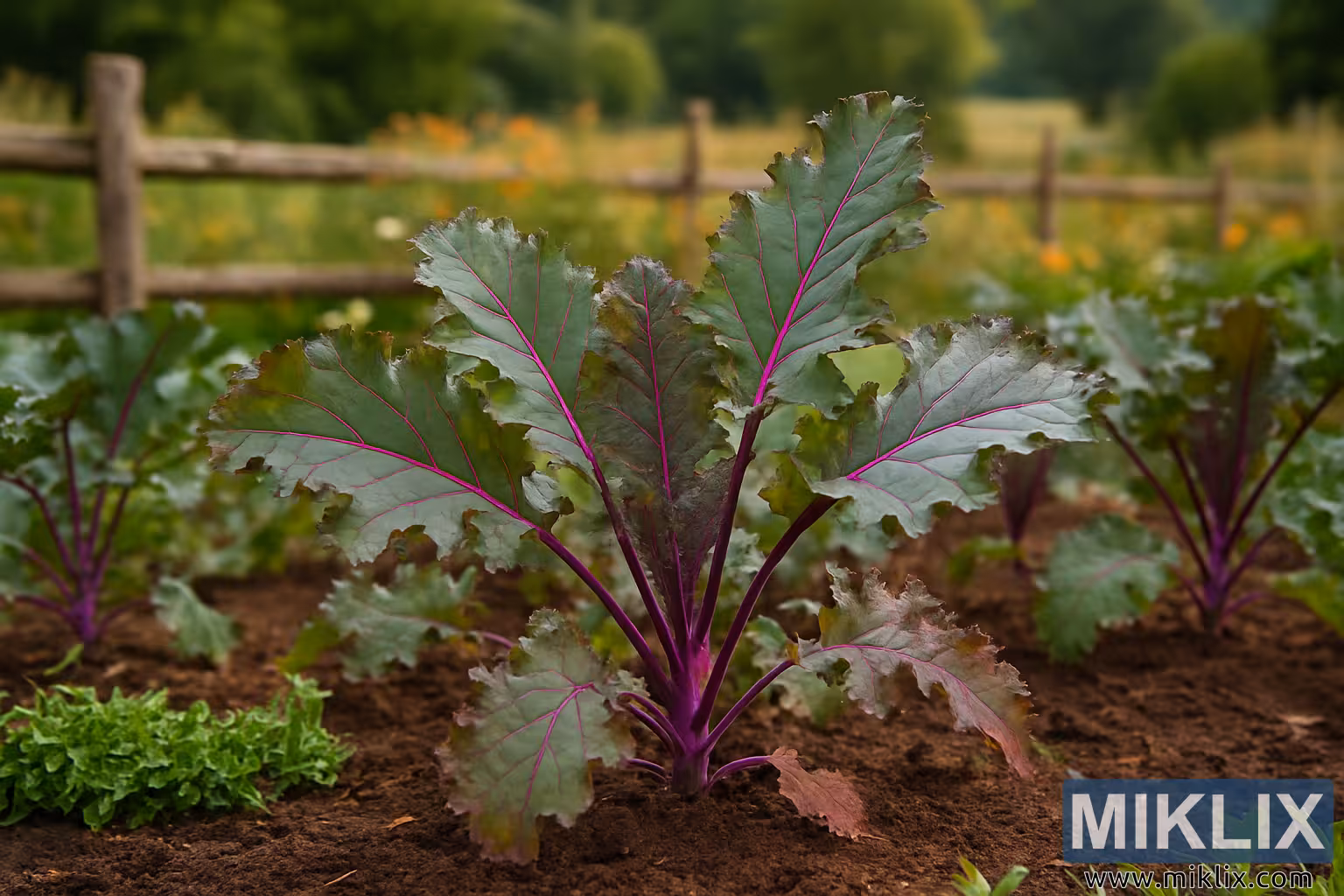Une photographie détaillée de chou frisé rouge russe s'épanouissant dans un jardin rural, montrant des feuilles luxuriantes aux nervures violettes, un sol terreux et une clôture en bois au milieu d'un cadre champêtre paisible.