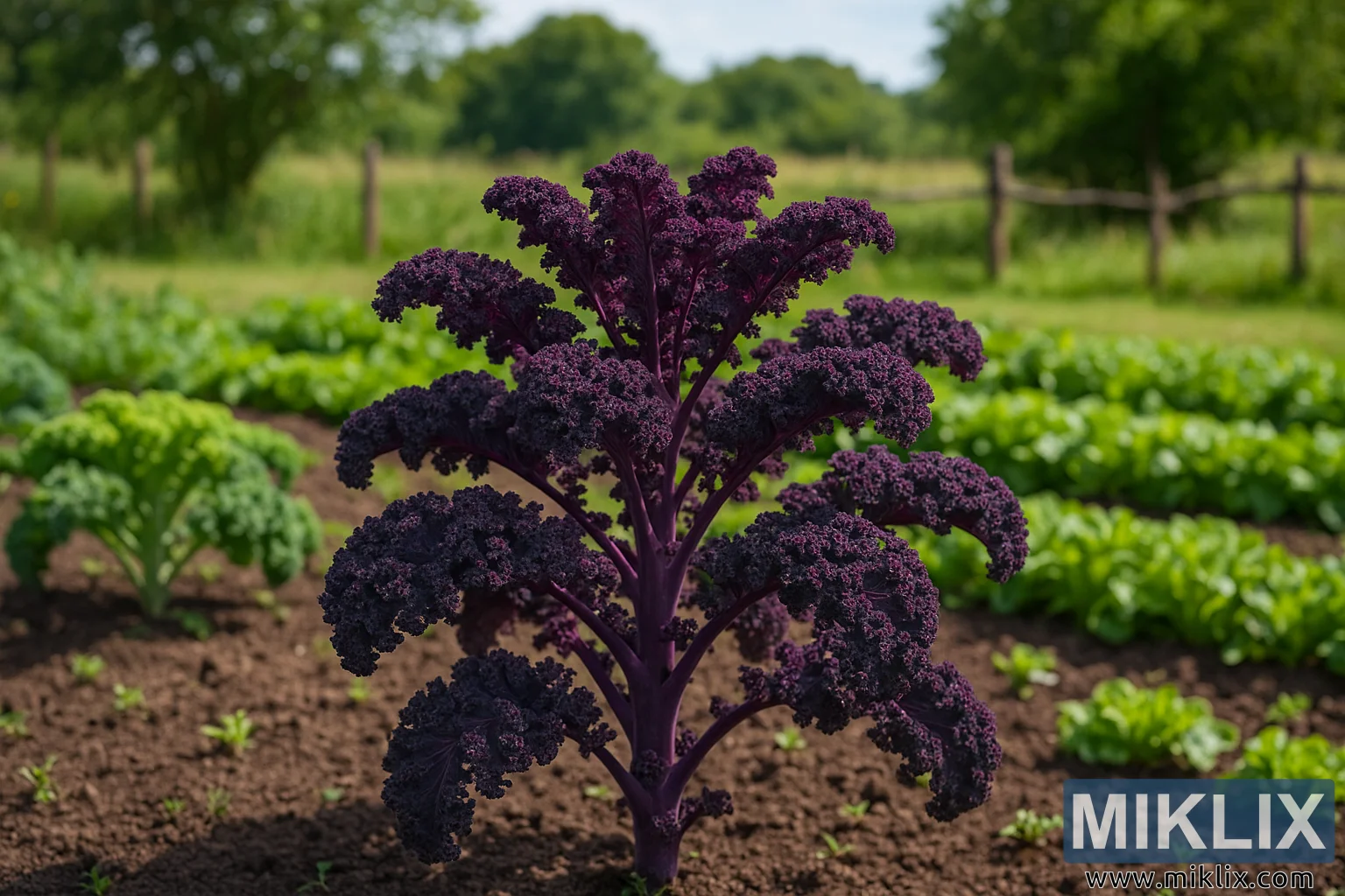 Une image haute résolution montrant du chou frisé Redbor s'épanouissant dans un jardin champêtre luxuriant. Ce chou aux feuilles frisées violettes se dresse fièrement sur fond de cultures vertes, de clôtures en bois et d'un paysage rural paisible.