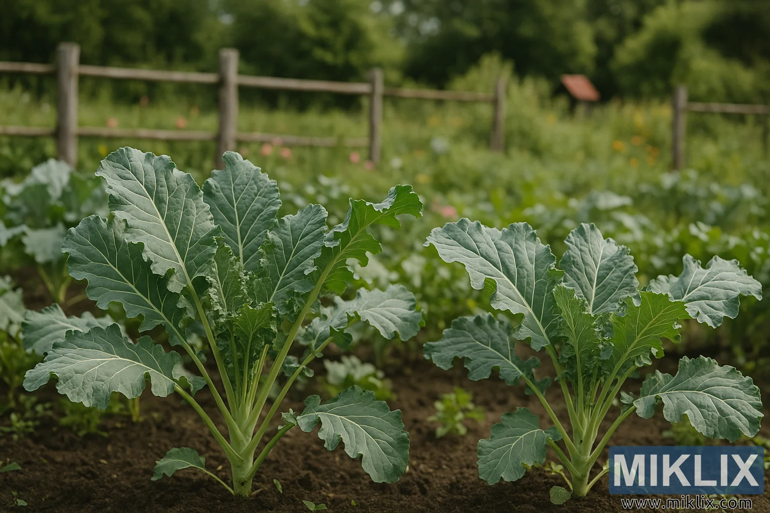 Photo détaillée d'un chou frisé de Sibérie s'épanouissant dans un jardin rural, montrant ses larges feuilles vertes sur un sol fertile et sombre, et une clôture en bois rustique sous la lumière naturelle.