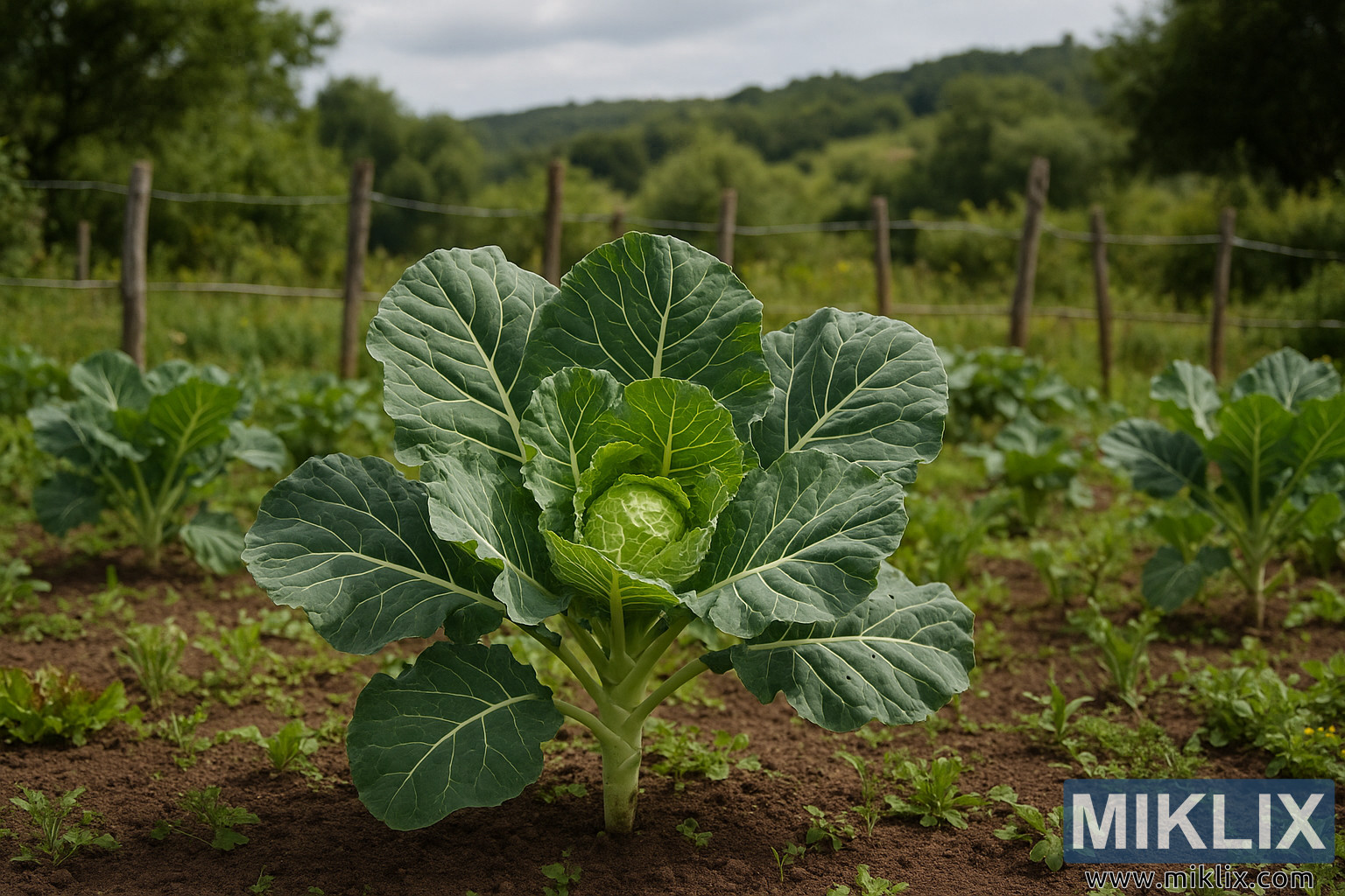 À l'arrière-plan, une clôture rustique en bois, faite de poteaux irréguliers et de fil de fer fin, délimite le jardin. Au-delà, un paysage luxuriant se déploie : des collines ondulantes recouvertes d'un épais feuillage vert et parsemées d'arbres qui se fondent dans la brume à l'horizon. Le bois au loin crée profondeur et contraste, attirant le regard du spectateur du détail immédiat du plant de chou frisé vers le panorama rural plus vaste.