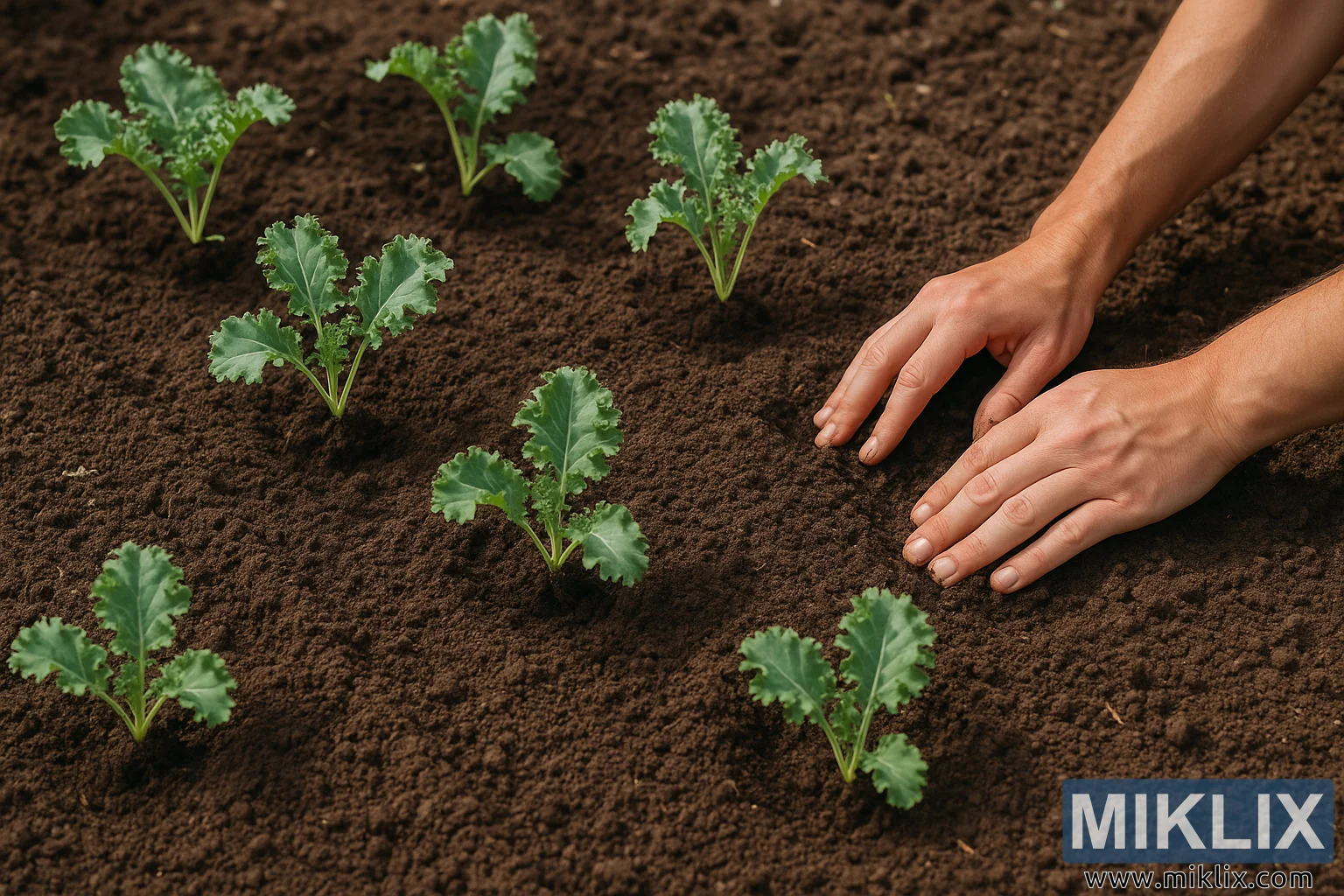 L'image capture un moment de jardinage serein et concentré dans un cadre extérieur luxuriant. Les mains d'un jardinier, propres mais légèrement teintées de terre, pressent délicatement la terre autour de jeunes plants de chou kale dans une plate-bande fraîchement préparée. La terre, sombre, riche et finement travaillée, est signe de bonne préparation et de fertilité. La photographie a été prise à la lumière naturelle, probablement le matin ou en fin d'après-midi, lorsque le soleil baigne la scène d'une douce lumière chaude. Les mains sont positionnées vers la droite du cadre, suggérant une plantation en cours, tandis que le reste de la plate-bande s'étend devant, planté de jeunes plants de chou kale régulièrement espacés et disposés en rangs réguliers.