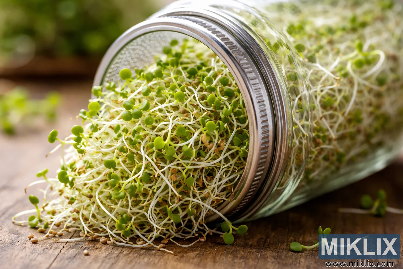 Photographie haute résolution de jeunes pousses de luzerne fraîches cultivées dans un bocal en verre, présentant des feuilles d'un vert éclatant et de délicates tiges blanches à la lumière naturelle.