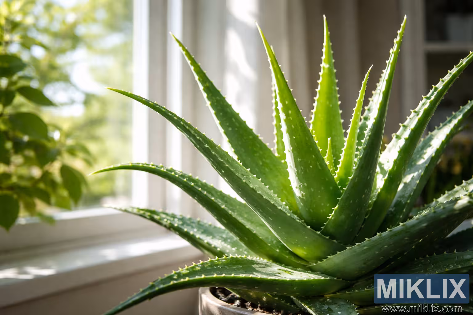 Photo haute résolution d'une plante d'aloe vera éclatante en intérieur, éclairée par une douce lumière indirecte près d'une fenêtre, évoquant la fraîcheur, le calme et le bien-être naturel.