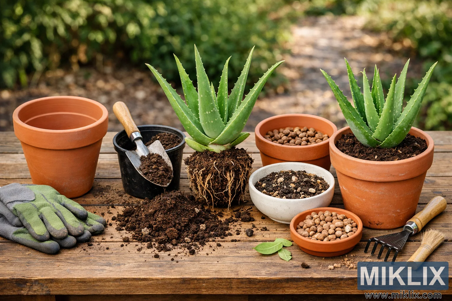 Dans l'ensemble, l'image se lit clairement de gauche à droite comme un guide pratique, expliquant visuellement chaque étape du rempotage d'un aloès. La composition équilibrée, l'éclairage naturel et les textures réalistes la rendent idéale pour des tutoriels de jardinage, des blogs lifestyle ou des supports pédagogiques axés sur l'entretien des plantes et le jardinage.