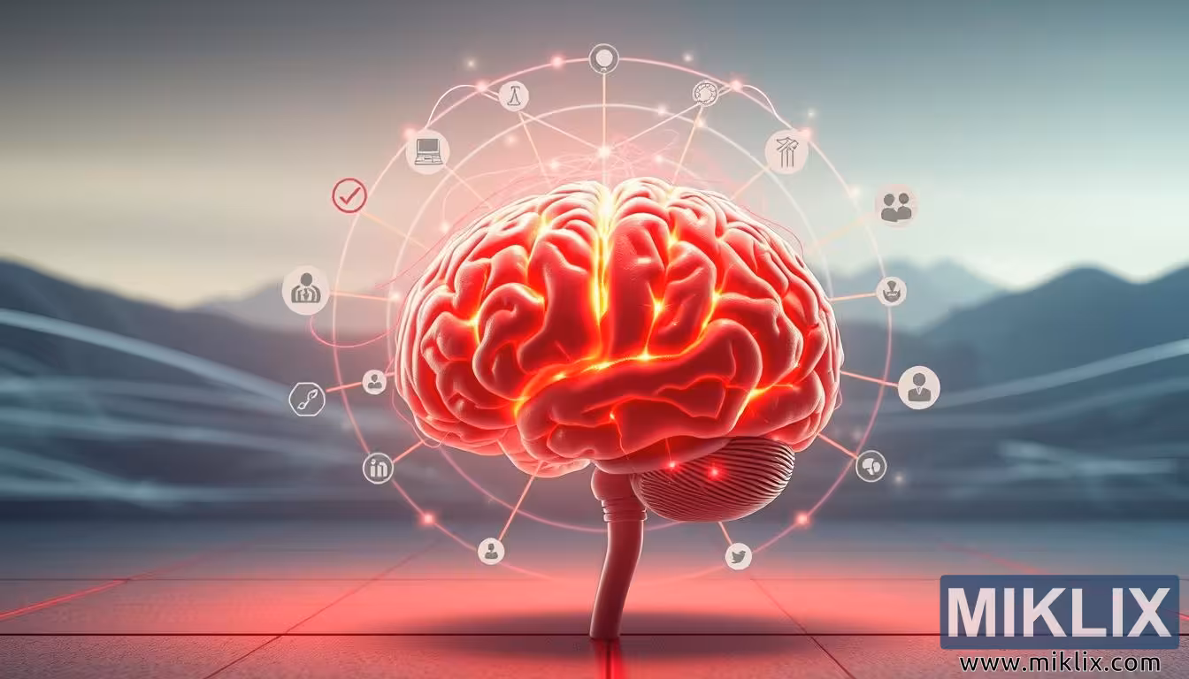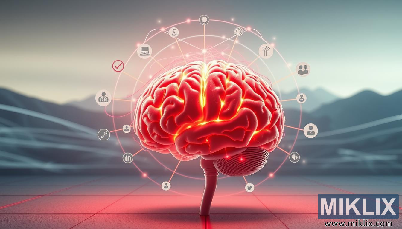 L'espace intermédiaire sert d'espace de transition, où l'interaction entre symbolisme numérique et représentation neuronale se fond dans un contexte plus large. De fins fils de lumière s'étendent du cerveau, se tissent dans le réseau d'icônes, puis se dissipent à l'arrière-plan. Ce choix de conception reflète la manière dont les processus biochimiques internes se propagent vers l'extérieur pour influencer les performances externes et les capacités du monde réel. L'équilibre entre éléments organiques et technologiques suggère que le cerveau est à la fois un système biologique et, à bien des égards, une machine naturelle avancée, réactive aux entrées et capable d'optimisation grâce à des interventions appropriées.