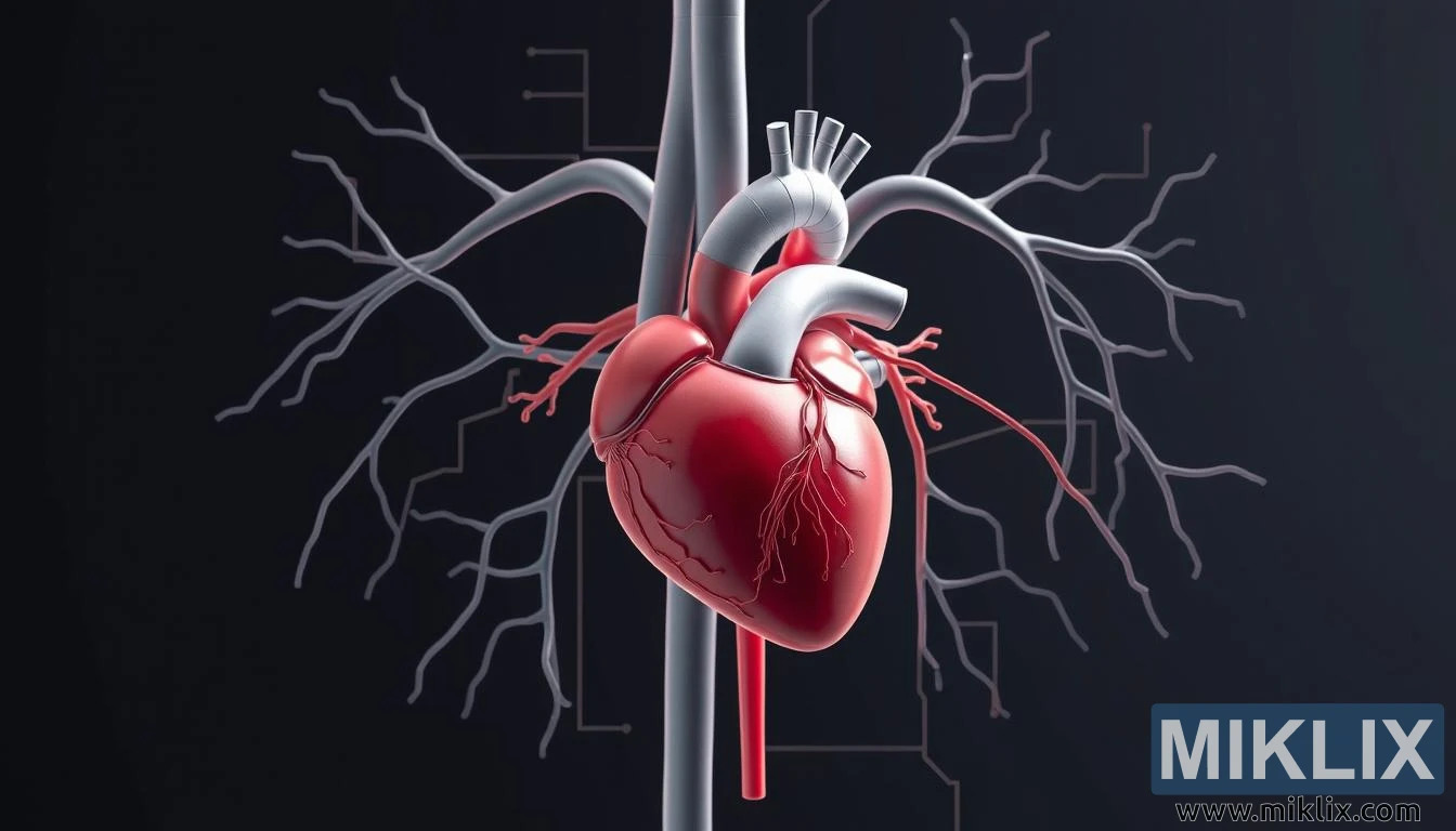 L'image présente une représentation schématique raffinée et méticuleusement réalisée du système cardiovasculaire humain, rendue vivante par un mélange de précision technique et de clarté artistique. Au centre de la composition se trouve le cœur, rendu dans de riches nuances de rouge qui soulignent à la fois sa forme musculaire et son rôle de pompe vitale. Ses cavités et ses vaisseaux de surface sont soigneusement définis, révélant les artères coronaires qui acheminent le sang riche en oxygène vers le muscle cardiaque, soulignant ainsi le double rôle de l'organe : moteur de la circulation et structure autonome. L'aorte s'élève nettement au sommet du cœur, se courbant vers le haut avant de se ramifier en artères qui se déploient en éventail, donnant immédiatement une impression de puissance et de direction au flux circulatoire.
