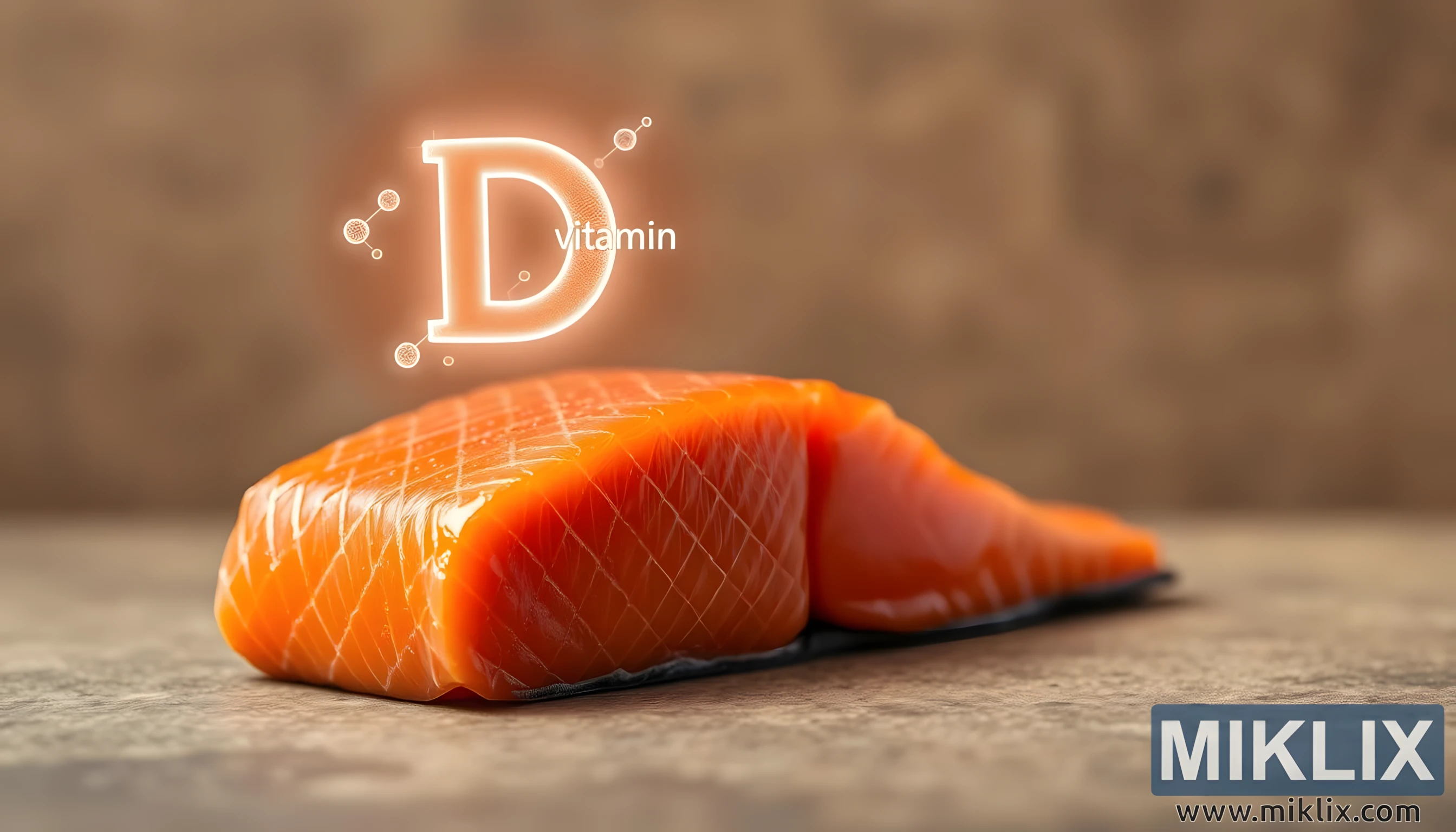 Juste au-dessus du saumon flotte une représentation lumineuse, presque éthérée, de la lettre « D », accompagnée de subtiles illustrations moléculaires ressemblant à de minuscules sphères lumineuses. Ce signal visuel souligne directement le rôle du saumon comme source abondante et naturelle de vitamine D, l'un des nutriments les plus essentiels à la santé humaine. La lueur qui entoure la lettre et ses molécules symboliques crée une atmosphère de pureté et de vitalité, comme si l'essence même de la santé rayonnait du saumon lui-même. C'est un doux rappel que la nourriture, dans son état le plus naturel et le plus brut, peut souvent être la forme de nutrition la plus puissante. L'interaction entre l'élément illustré et le sujet organique élève l'image au-delà d'une simple scène culinaire pour en faire un récit visuel éducatif et inspirant.