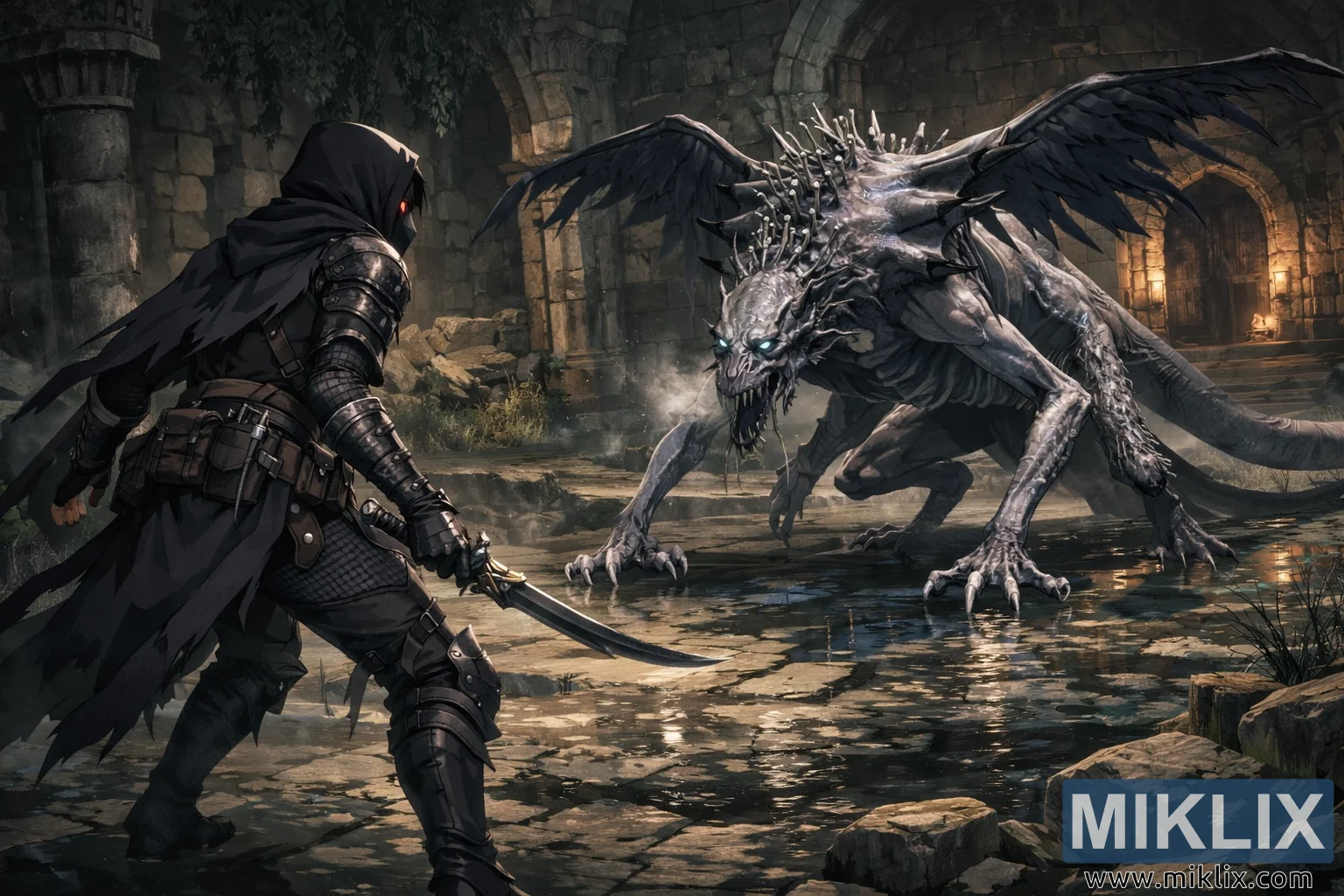 Rather than depicting active combat, the artwork focuses on anticipation—the fragile pause where strategy, fear, and determination converge. Every element, from the warrior’s measured grip on the blade to the creature’s poised claws and the stillness of the surrounding ruins, contributes to a sense of suspended time. The composition invites the viewer to imagine the explosive motion that will follow, making the quiet before the storm feel more powerful than the battle itself.